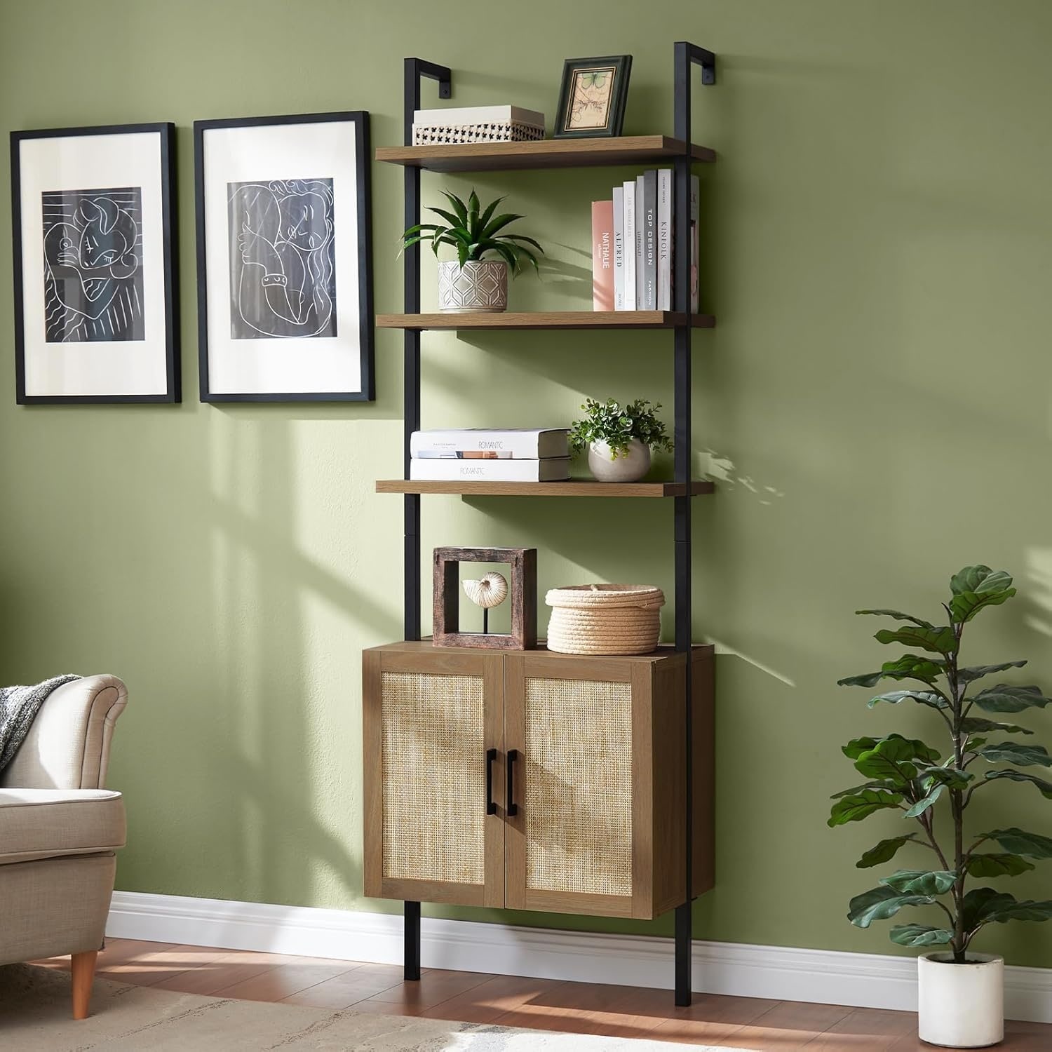 5-Tier Tall Bookcase with Rattan Cabinet, Steel Frame, and Wall Mount Design for Living Room