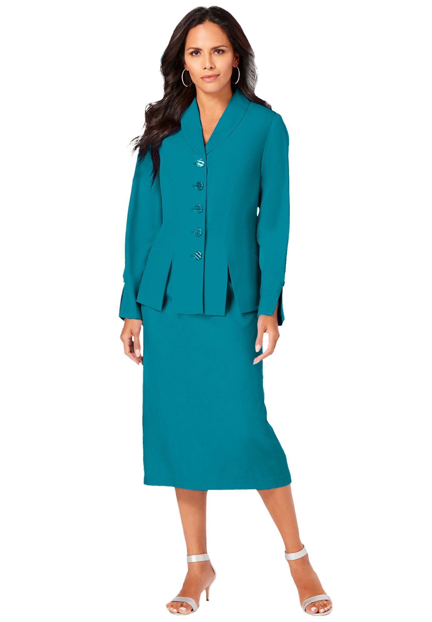 Plus Size Women's Plus Size Long Sleeve Shawl-Collar Jacket & Sheath Skirt Set - 2-Piece Suit by Roaman's in Deep Turquoise (Size 16 W) Skirt Suit