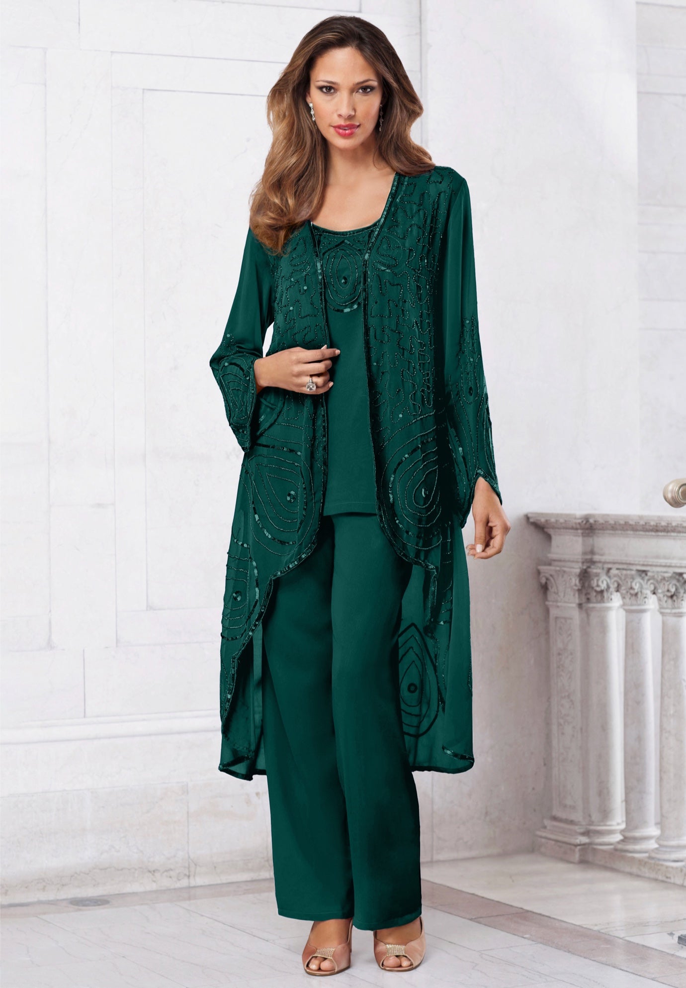 Plus Size Women's Plus Size Beaded Georgette 3-piece Pant Set - Formal Wear by Roaman's in Emerald Green (Size 14 W) Sheer Jacket Formal Evening Wear