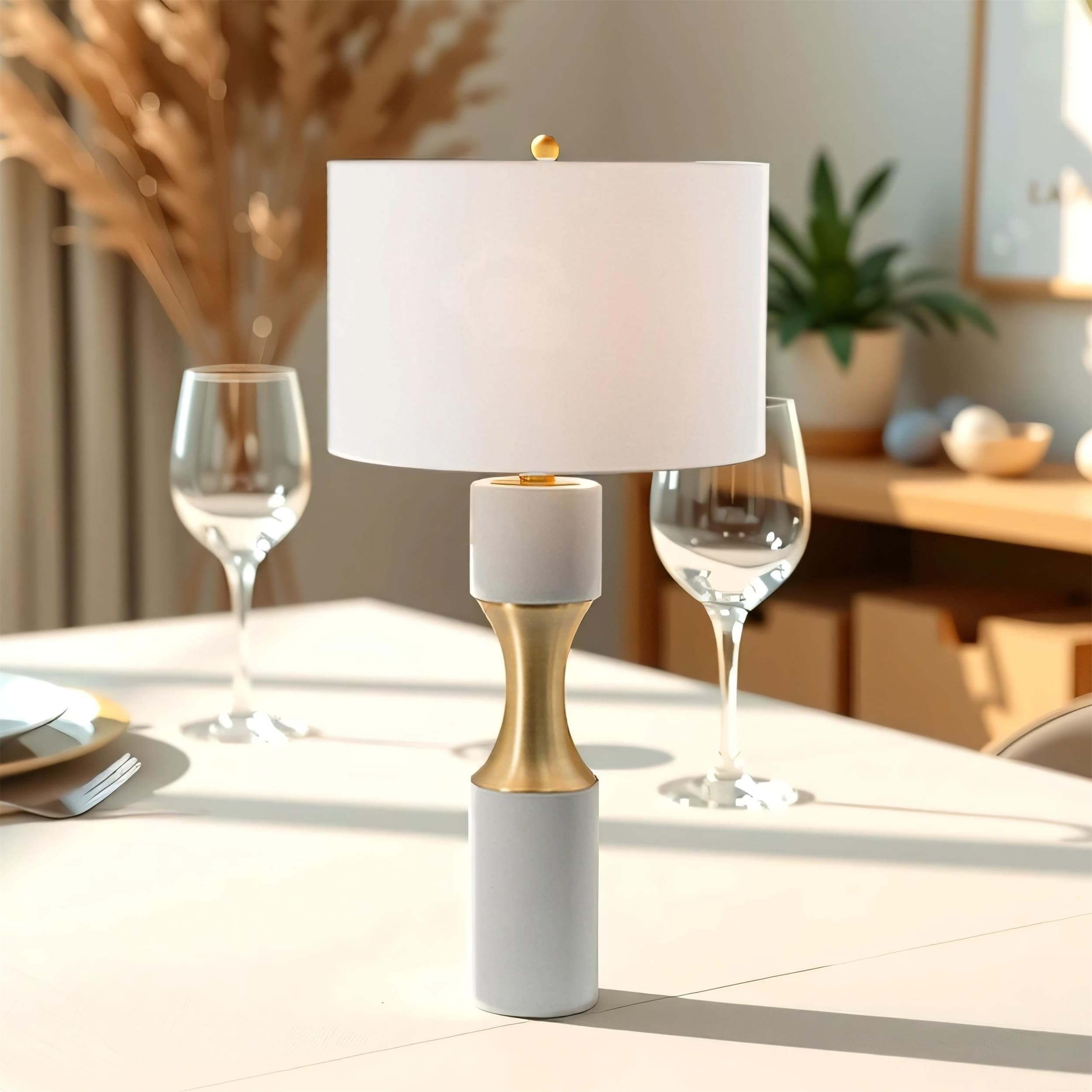 30 inch Cement Table Lamp, Brass Finish Metal Band, White Drum Shade