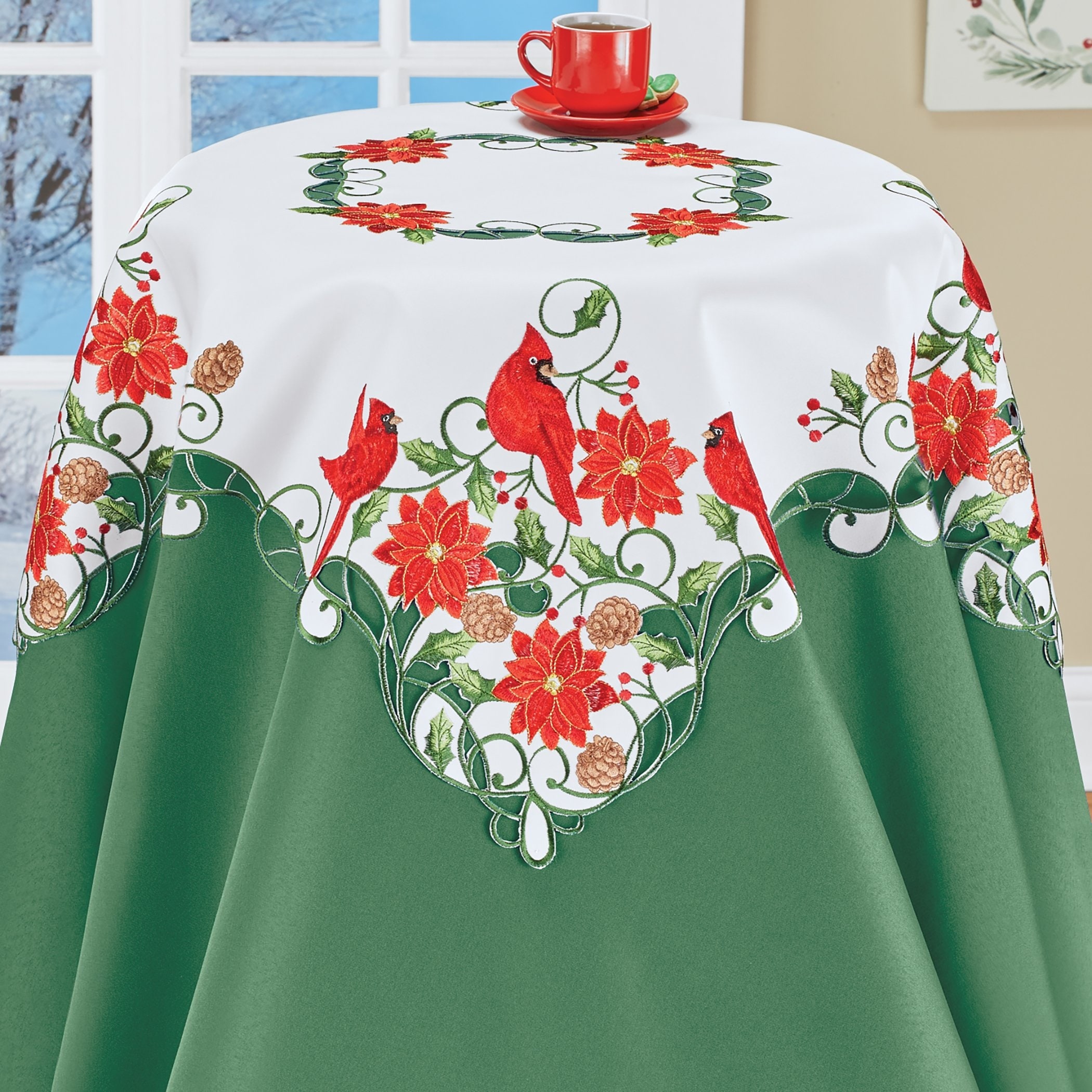 Embroidered Cardinal Trio Poinsettia Table Linens