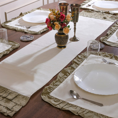 '7-Piece Ruffled Green White Cotton Table Runner Placemat Set'