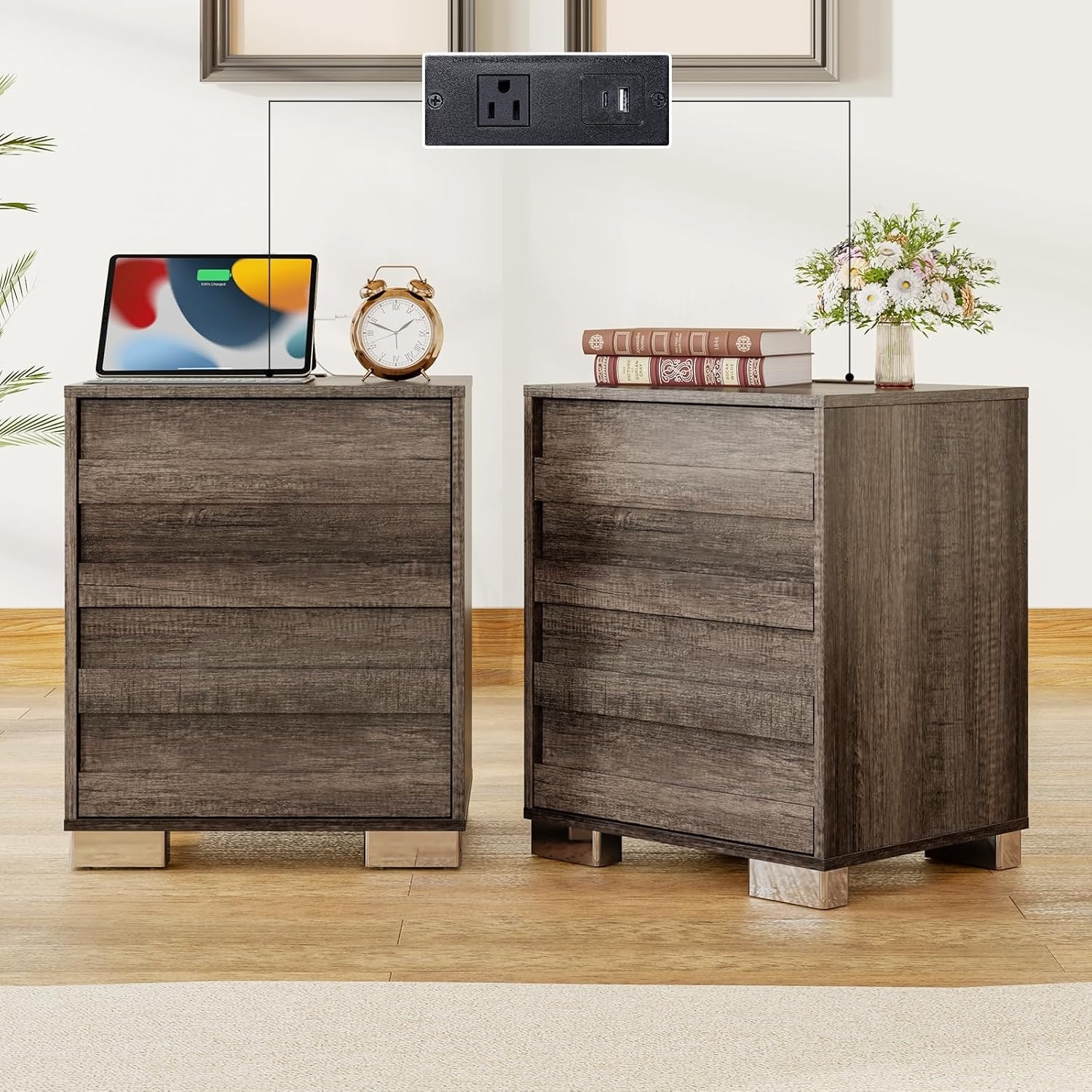 Set of 2 Nightstands with Charging Station, Farmhouse End Tables with Drawers, Rustic Grey Finish