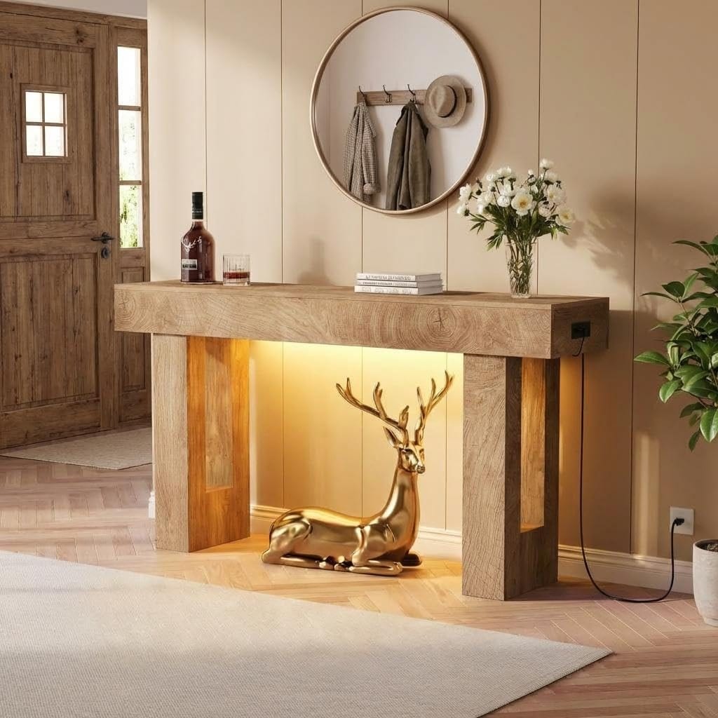 63" Farmhouse Console Table with Motion Sensor Light, Rustic Entryway Sofa Table with Shelves for Hallway