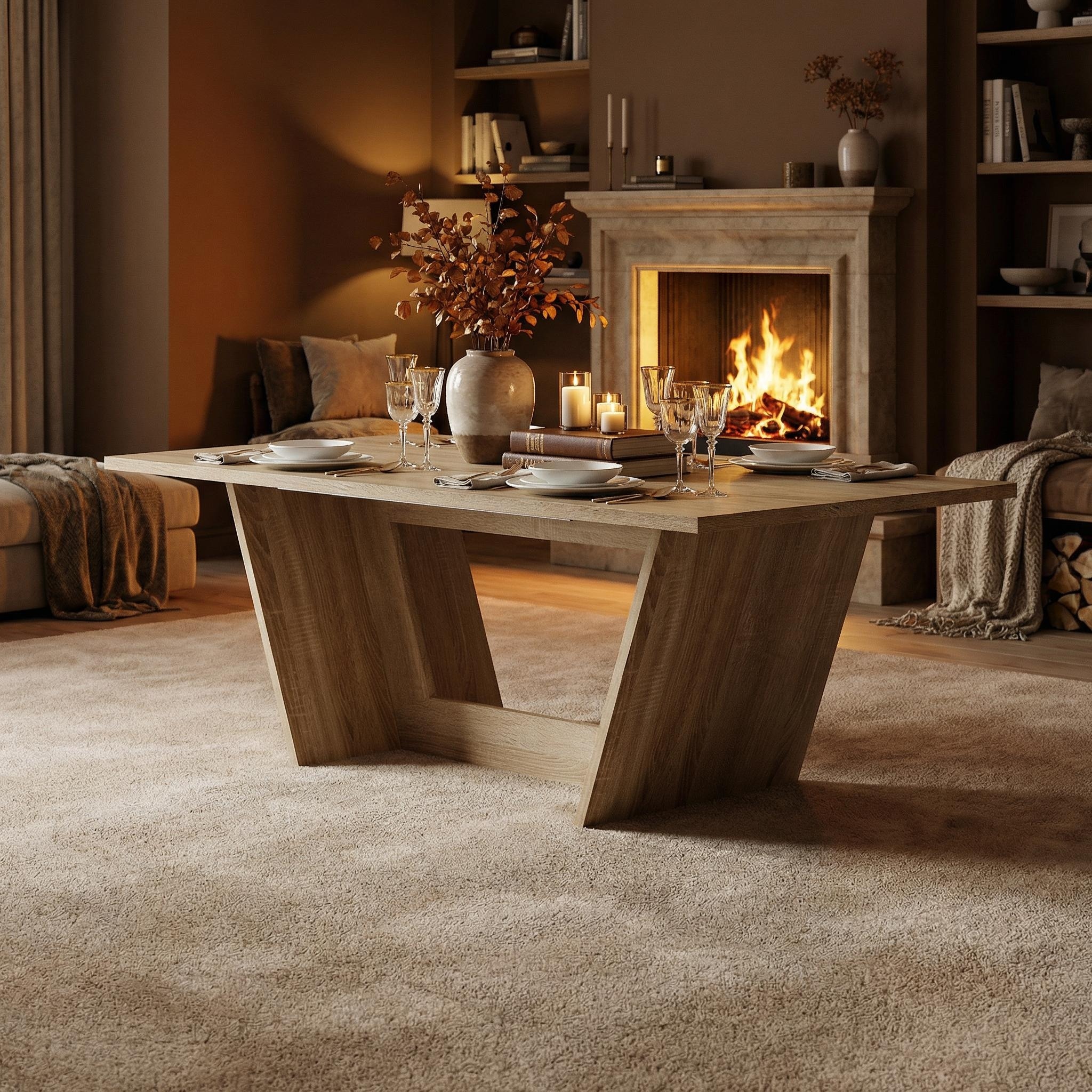 81.5 Inch Dining Table for 6, Rectangular Oak Finish Kitchen Table with Geometric V-Base, Large Wood Grain Dining Room Table