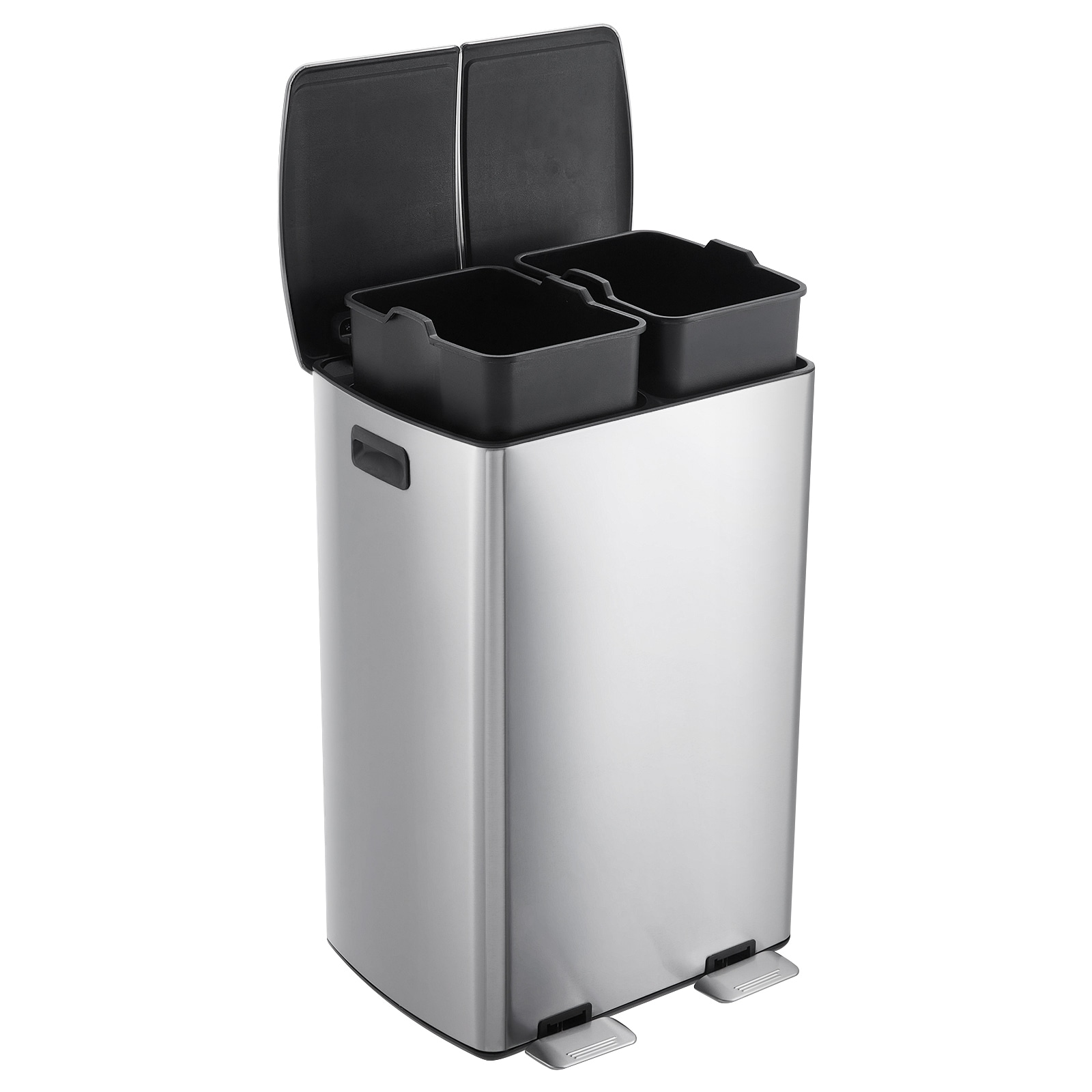 Stainless Steel Dual Compartment Trash Can with Soft Close Lid Foot Pedal and Removable Inner Buckets