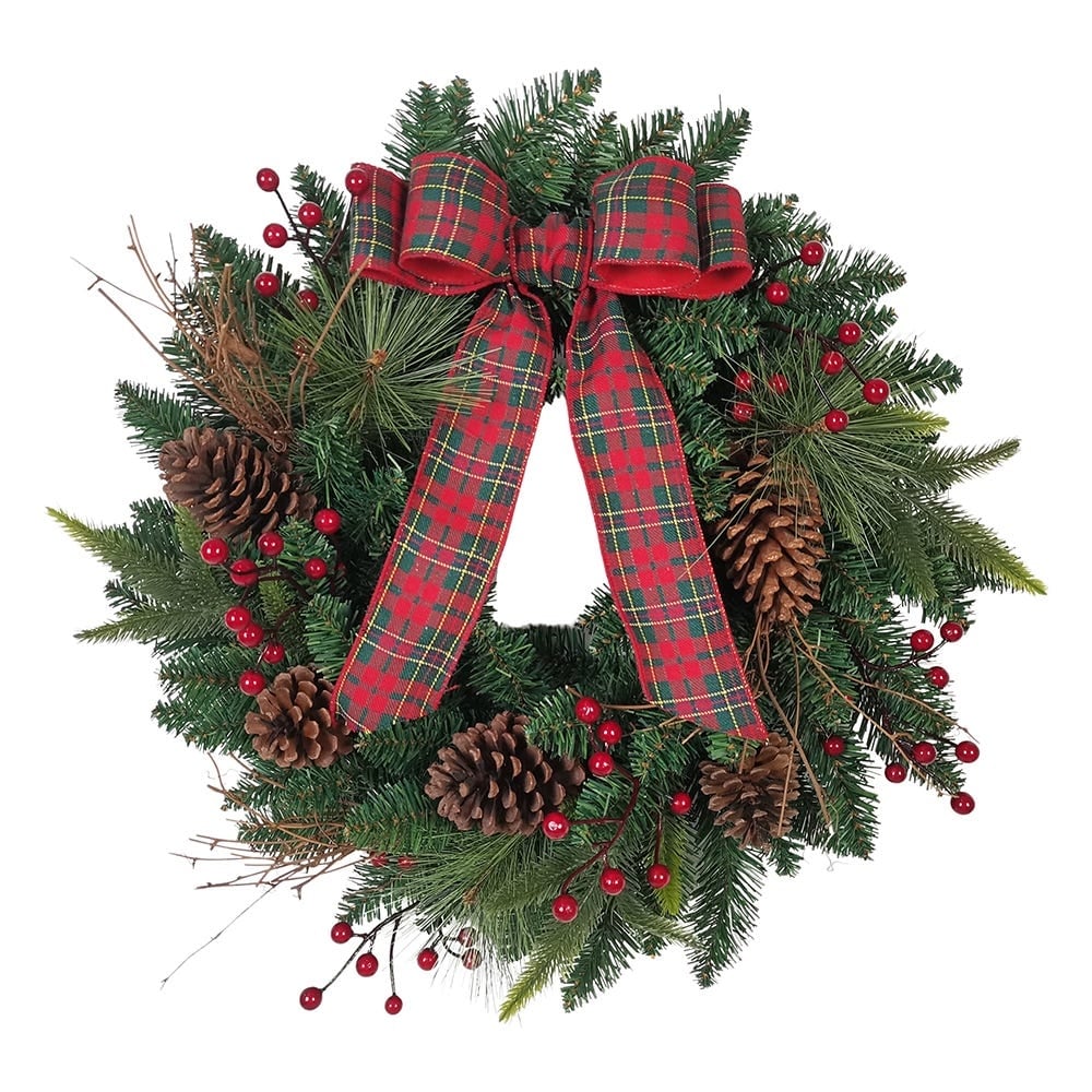 Kurt Adler 24-Inch Decorated Unlit Green Wreath with Bow, Holly Berrys and Cones