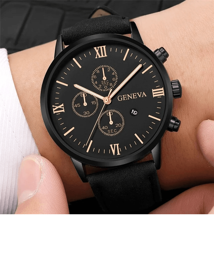 Mens Casual Leather Quartz Watch With Calendar black Gold