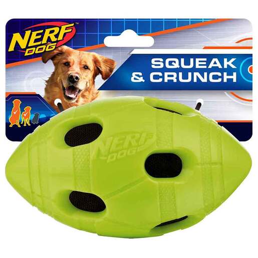Nerf Dog Crunch Bash Football - Stay in the game with the Nerf Dog Crunch Bash Football! The durable body stands up to extended chewing, and makes squeaking and crunching sounds that dogs love. Plus, it has rasied grooves that makes it easier to grip for both of you! Great for toss and fetch, or solo play sessions. Sturdy rubber and nylon.