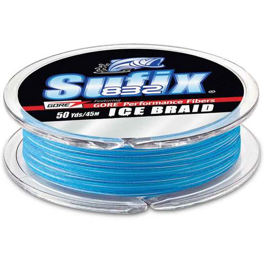 Sufix 832 Advanced Ice Fishing Braid - The strongest, most durable small diameter ice braid. R8 Precision Braiding and fiber technology provide superior strength, roundness and line consistency. The Sufix 832 Advanced Ice Fishing Braid has 8 fibers (7 HMPE Fibers plus 1 GORE Performance Fiber) and 32 weaves (pics) per inch. GORE Performance Fibers add incredible fray and abrasion resistance for unmatched durability. HMPE Fibers provide high strength & sensitivity, small diameter & hydrophobic water-repellent protection that resists freezing.