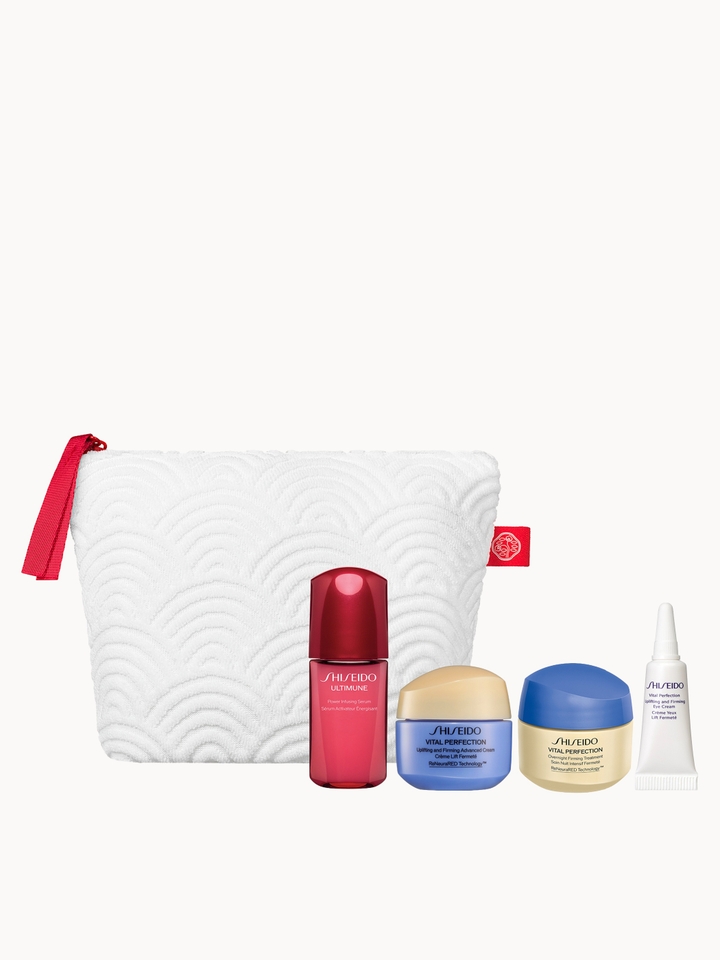Elevate your skincare routine with the Shiseido Vital Perfection Firm & Lift Starter Kit, a four-piece collection including a range of essential mini beauty favourites. The skincare gift set is suitable for mature skin types. Set Contents: Ultimune Power Infusing Serum 10ml Enhanced with advanced technologies and an exclusive patented Power Fermented Camellia, the serum helps to minimise a loss of elasticity and firmness by supporting the skin’s natural moisture barrier. Vital Perfection Uplifting & Firming Advanced Cream 15ml Featuring patented Power Fermented Camellia, the best-selling moisturiser helps to minimise the appearance of visible signs of ageing, including fine lines and a loss of elasticity. Vital Perfection Overnight Firming Treatment 15ml A night cream designed to reduce the appearance of fine lines and dullness as you sleep. The formula uses exclusive SafflowerRED™ to enhance the look of elasticity that appears to be depleting. Vital Perfection Uplifting and Firming Eye Cream 3ml Designed to address the eye area, the cream helps reduce the look of dark circles, fine lines and puffiness. ReNeura Technology++™ works to visibly firm, while MATSU-ProSculpt Complex encourages a smoother look.