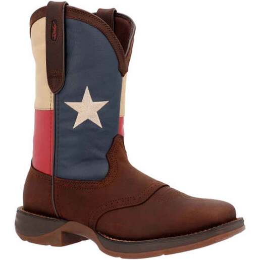 Durango Men's Rebel Texas Flag Western Boots - You have to admit, there's just something about the great state of Texas. To show your pride, go ahead and pull on these patriotic western boots. Square toe EVA midsole Tempered steel shank Cushion Flex insole Rolled shank area Soft mesh lining Contoured, ventilated, and removable cushion footbed Double row sole stitch Distressed full-grain leather foot, collar, and pull straps with faux shaft Abrasion-resistant translucent rubber outsole DSS Durango Suspension System for all-day comfort, flexibility, and durability 1 3/8in Rebel heel for a steady stride Style: DB4446