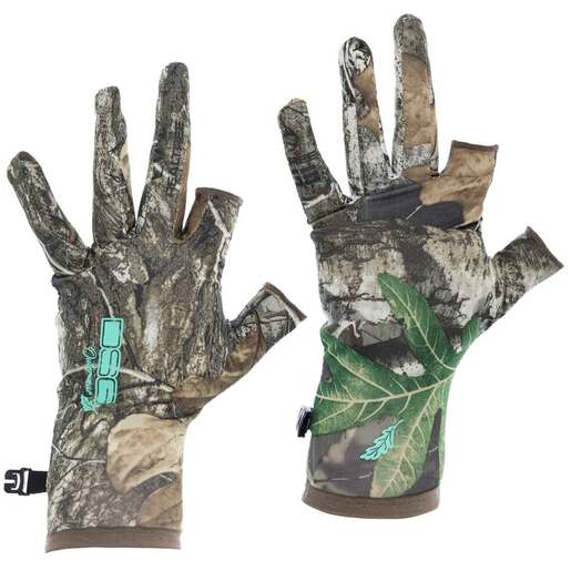 DSG Outerwear Women's Realtree Edge Featherweight Hunting Gloves - The new Featherweight Gloves are designed for warm weather concealment. The exposed index and thumb allow for you to take your best shot while staying camouflaged. Lightweight and comfortable polyester spandex 4-way stretch material Exposed index finger and thumb DSG logo Style: 519149