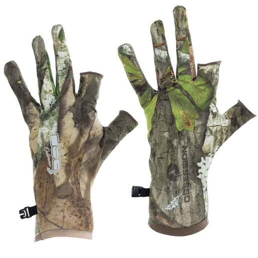 DSG Outerwear Women's Mossy Oak Obsession Featherweight Hunting Gloves - The new Featherweight Gloves are designed for warm weather concealment. The exposed index and thumb allow for you to take your best shot while staying camouflaged. Lightweight and comfortable polyester spandex 4-way stretch material Exposed index finger and thumb DSG logo Style: 519194