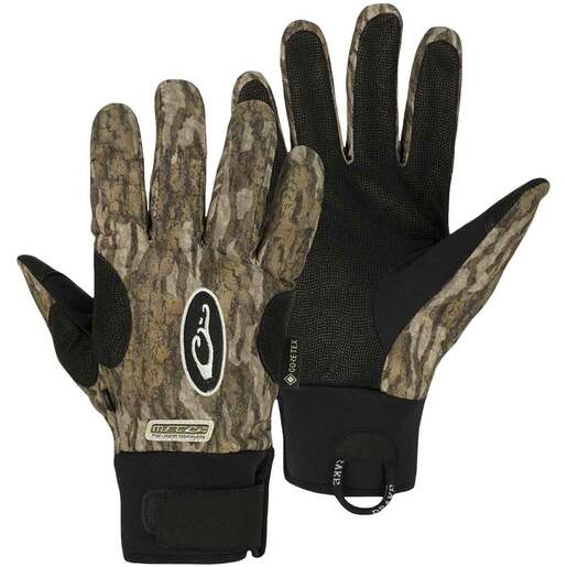 Drake Men's Mossy Oak Bottomland Refuge HS GORE-TEX Hunting Gloves - The MST Refuge HS GORE-TEX Gloves are designed for those "in-between" times of the season where you need more than a lightweight glove, but it isn't nearly cold enough for a heavily insulated glove. Stay-Put liner system bonds the liner to the glove so there is no twisting and bunching inside the glove Adjustable gusseted Velcro cuff closure for a secure fit Pull loop assist makes it easier than ever to put gloves on Refuge HS outer fabric treated with DWR Waterproof, breathable GORE-TEX membrane Digitized goatskin leather palm 180gram fleece lining Style: DA5030-006
