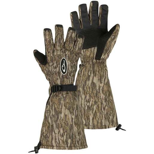 Drake Men's Mossy Oak Bottomland Refuge HS GORE-TEX Double Duty Decoy Hunting Gloves - The MST Refuge HS GORE-TEX Double Duty Decoy Gloves are the ultimate gauntlet-style gloves for waterfowl hunters. The glove is constructed of our Refuge HS shell fabric and treated with DWR to act as the first line of defense against the elements. Refuge HS outer fabric treated with DWR Waterproof, breathable GORE-TEX membrane Digitized goatskin leather palm Stay-Put liner system bonds the liner to the glove so there is no twisting and bunching inside the glove Adjustable shock cord cuff closure with cord lock, keeps wind out and locks in heat Full gauntlet length fits over coat Style: DA5040-006