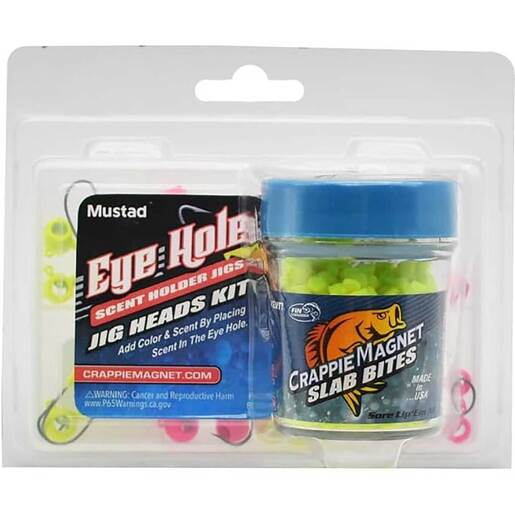 Leland's Lures Crappie Magnet Eye Hole Jig Head Bundle - The Eye Hole Jig is the first jig head that holds your scent in place. Add scent and color by placing scent in the eye hole of the lure. It locks the scent in place, allowing you to catch multiple fish on just one scent. Kit includes Crappie Magnet Slab Bites scents for long-lasting, fish-catching scent. 12 Hammerhead Scent Holder Jig Heads 12 Round Scent Holder Jig Hea 1 Jar Crappie Magnet Slab Bites