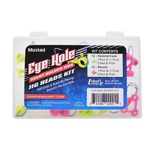 Leland's Lures Crappie Magnet Eye Hole Jig Heads Kit - Lelands 24 piece Eye Hole Kit includes both Round Head and Hammer Head Eye Hole Jigs. The hole allows you to put attractant inside to increase the bite ratio. Kit includes (3) 1/16th chartreuse (3) 1 1/16th pink (3) 1/8 charteuse (3) 1/8 pink in both round and hammer head