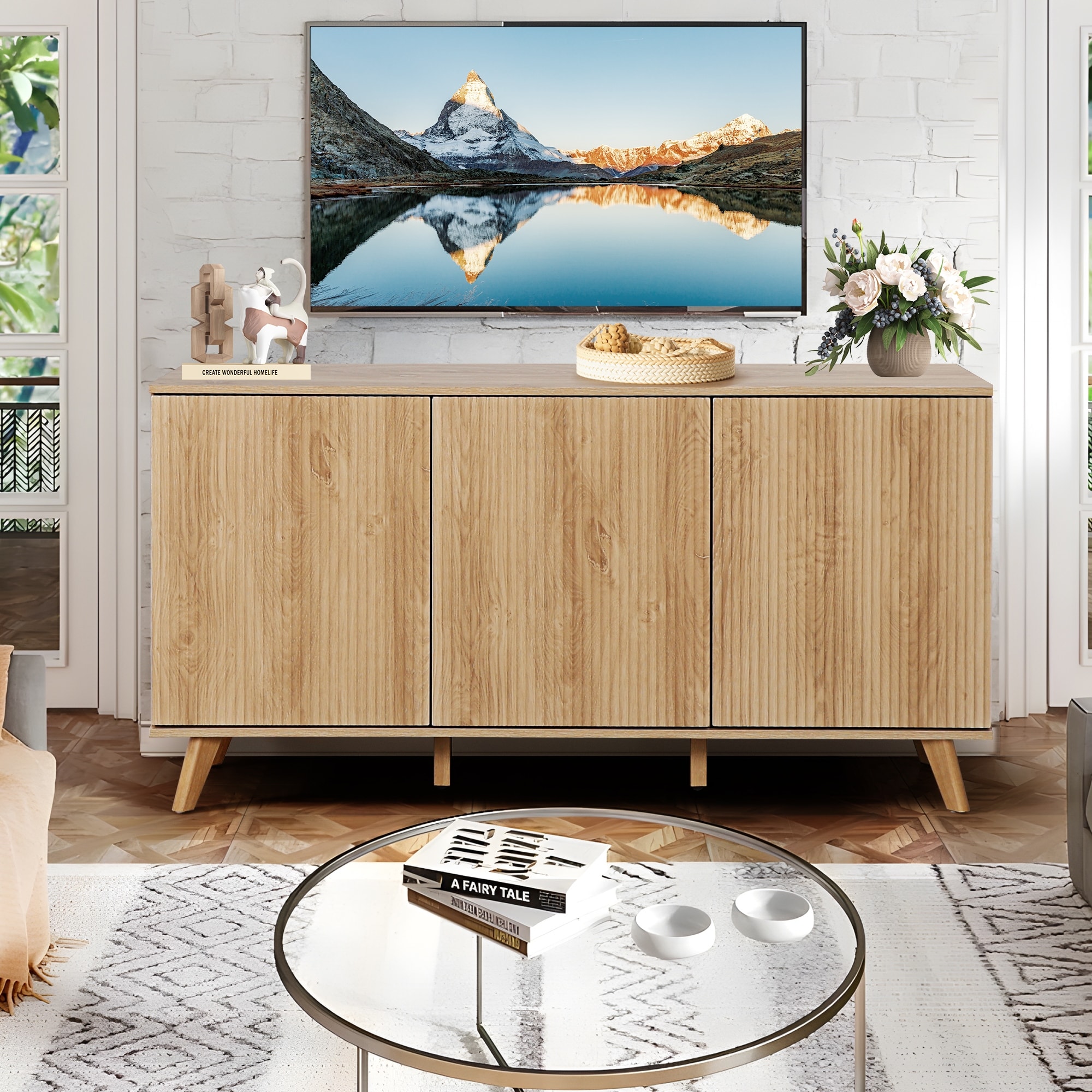The product is 30.32 inches high and 57.87 inches long. It can be placed in the kitchen as a storage cabinet, in the living room as a storage area for items, or as a TV cabinet.