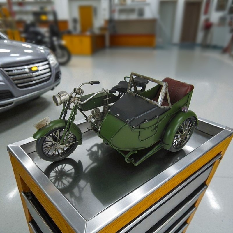 Metal Motorcycle with Side Cart Decoration in Army Green