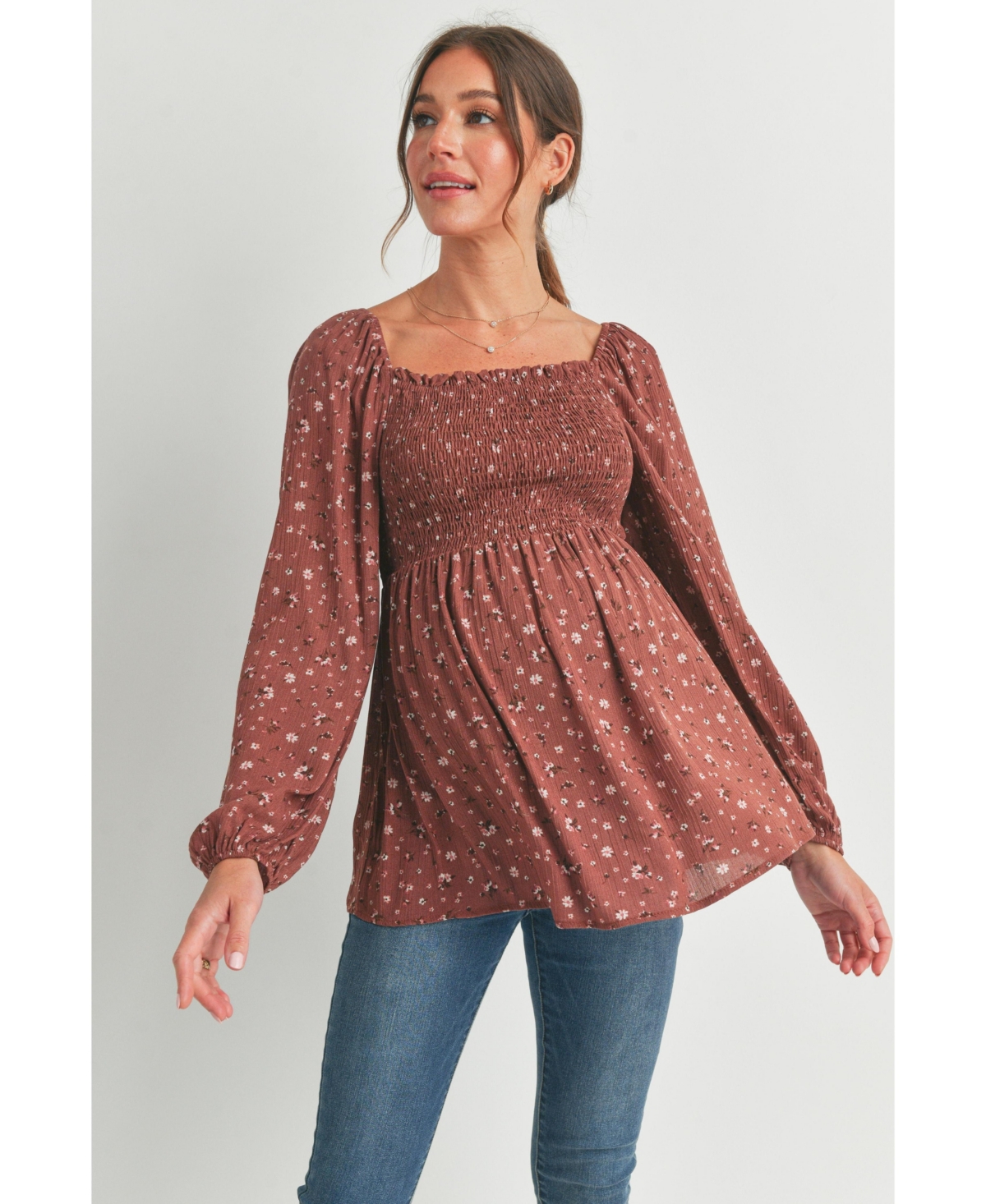Hello Miz Maternity Smocked Square-Neck Floral Blouse - Brown