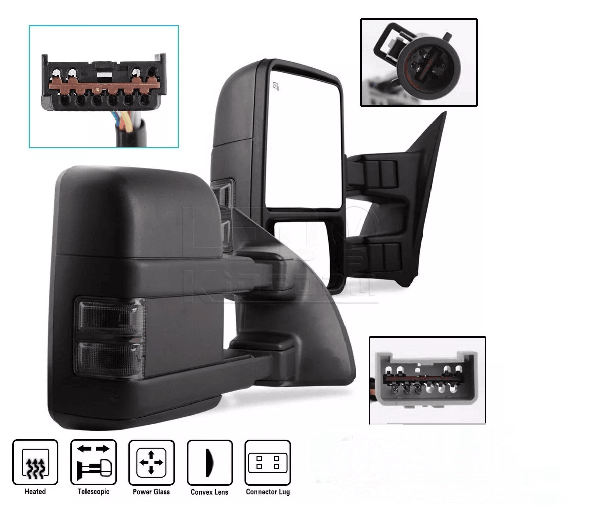 Power Heated Tow Mirrors For 19992007 Ford Super Duty Smoke Turn Signal, Manual Telescoping, Dual Arm, Pair Power Heated Tow Mirrors For 19992007 Ford Super Duty Smoke Turn Signal, Manual Telescoping, Dual Arm, Pair