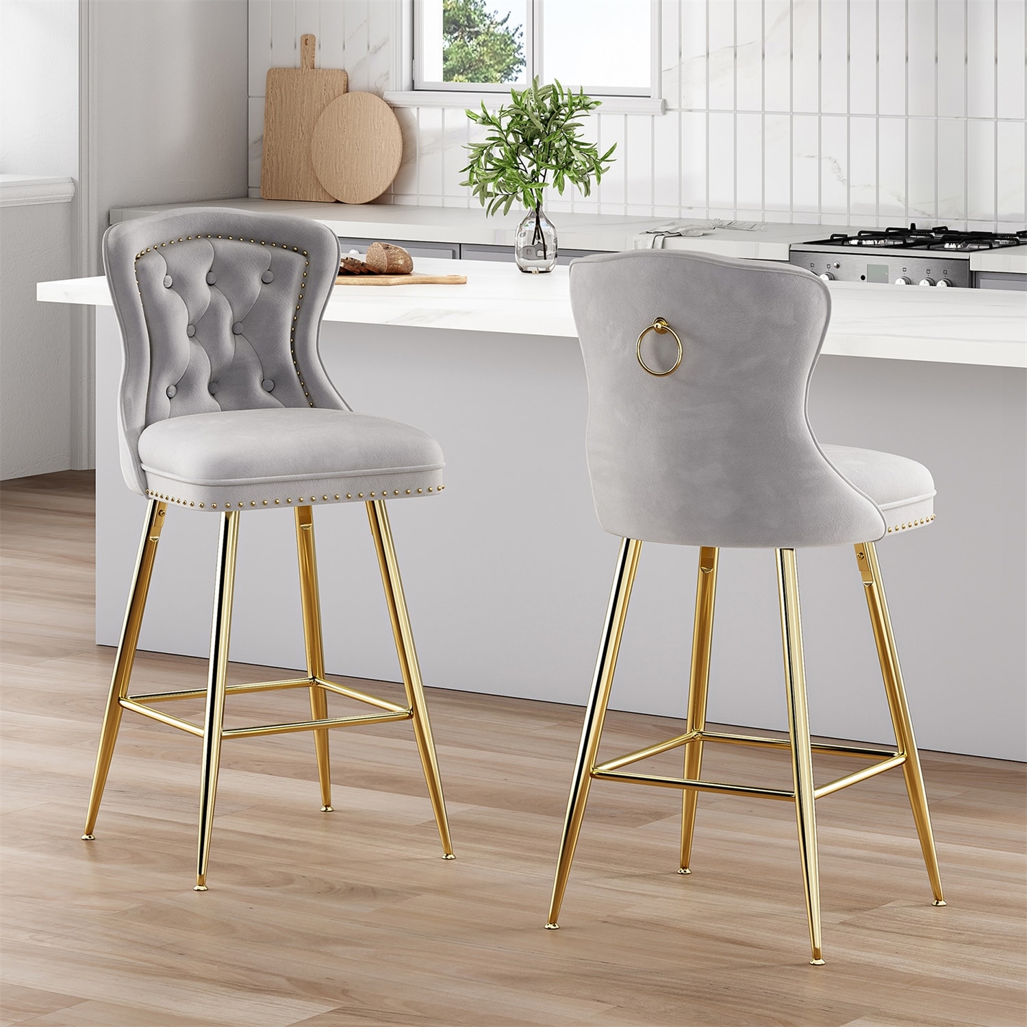 Velvet Bar Stools with Metal Legs, Button Tufted and Nailheads Trim (Set of 2)