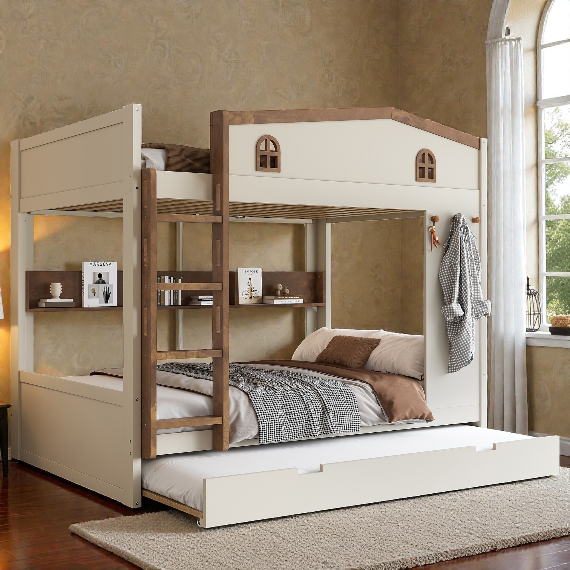 Solid Wood Bunk Bed with Trundle and Storage Shelves, Full Over Full/Queen Over Queen Bunk Bed with Hooks