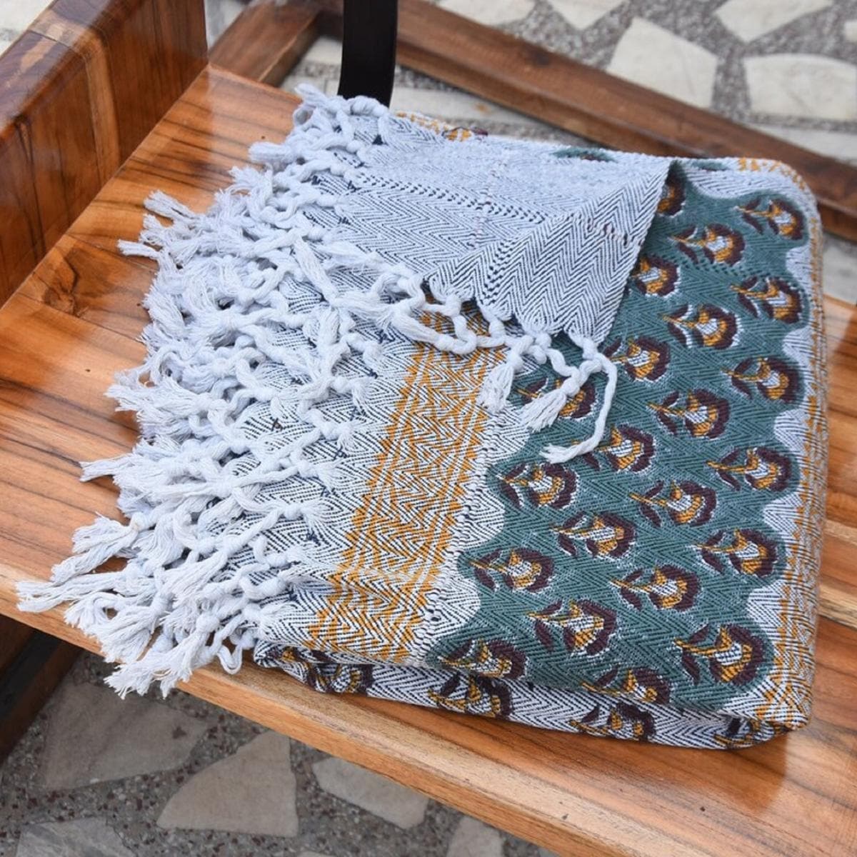 Fabdivine Rohini Handwoven Cotton Throw Blanket - Floral Block Print Decorative Home Accent with Artisan Fringe, 90" x 54"