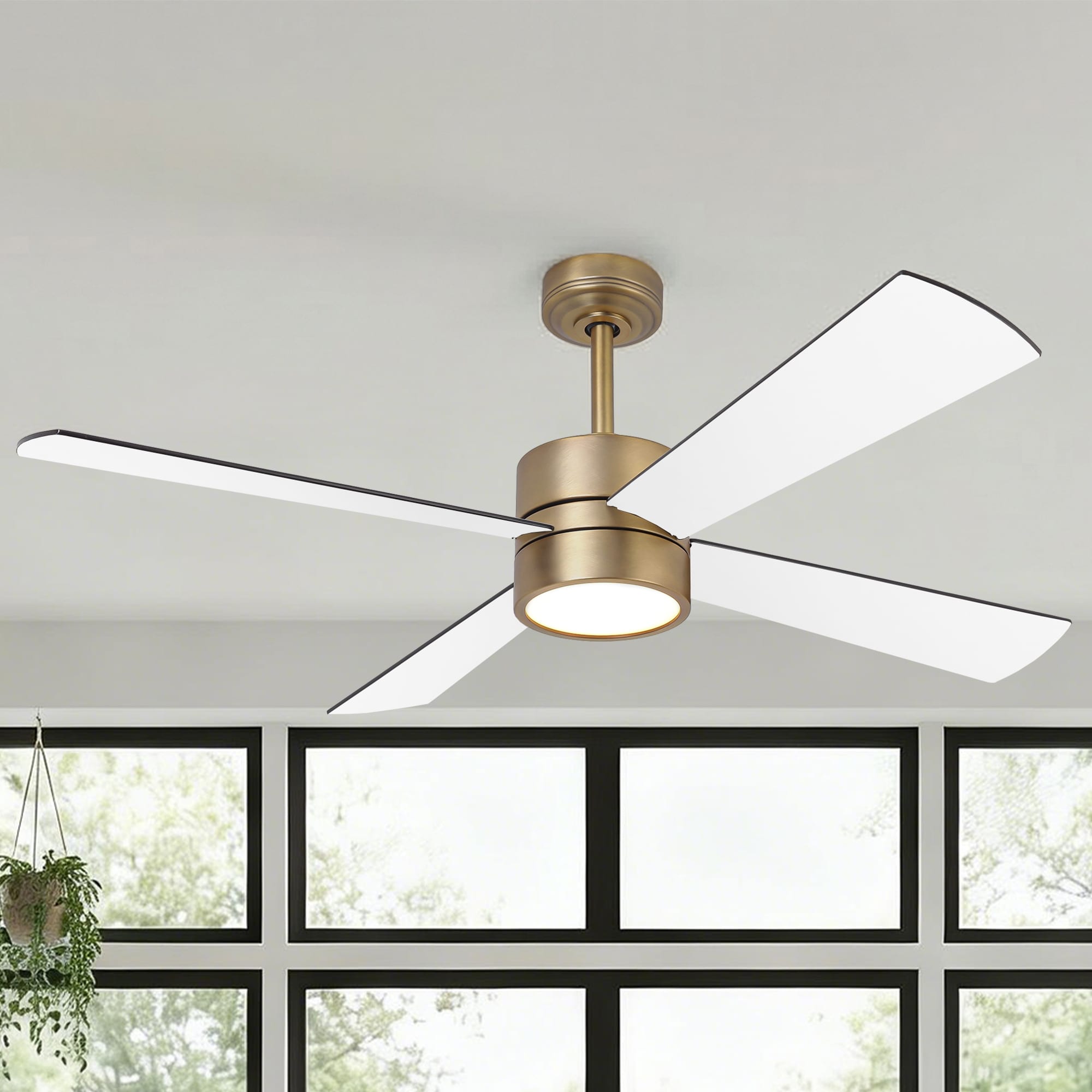 52-inch Natural Brass Plywood Indoor Downrod Mount Ceiling Fan with Integrated LED and Remote Control