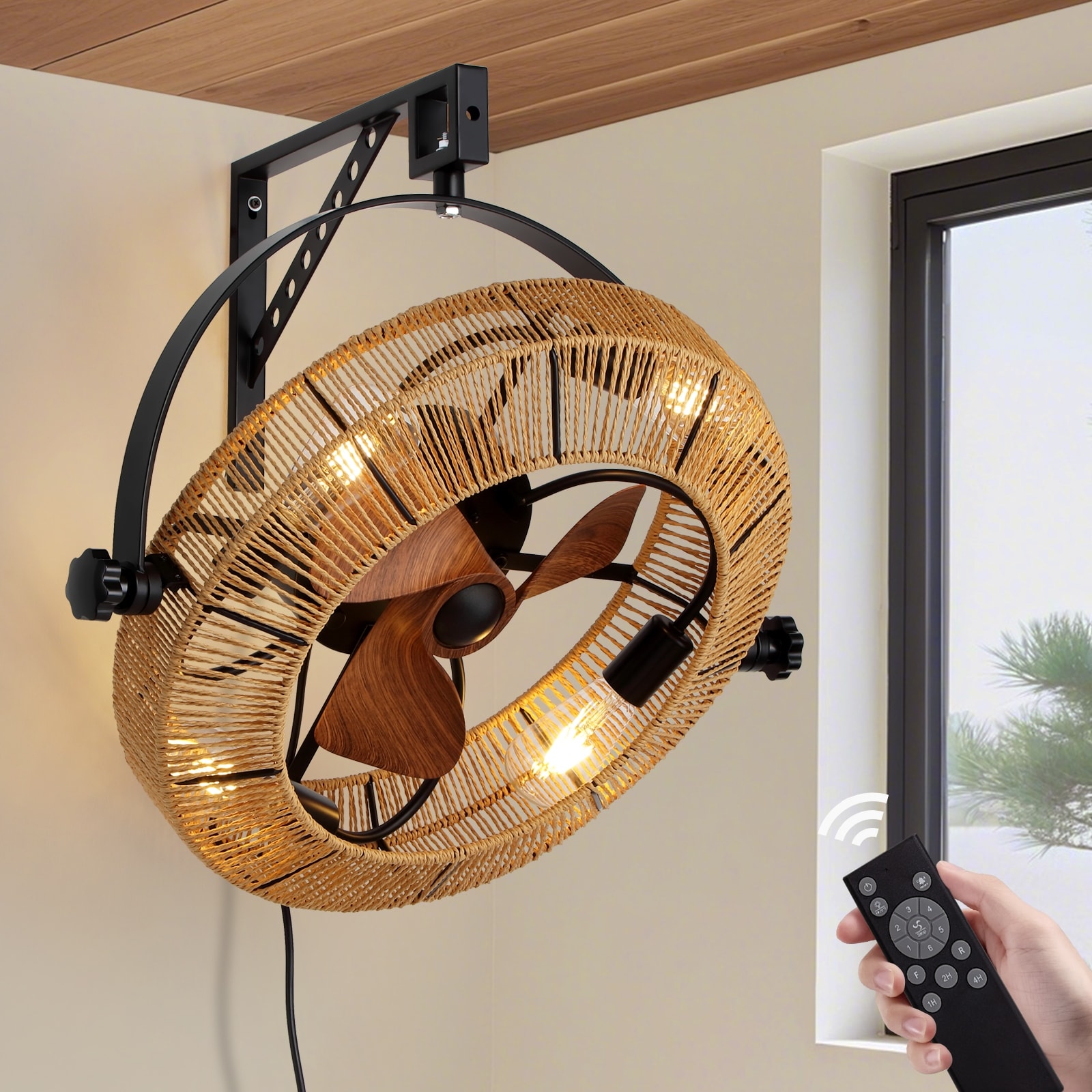 Boho Wall Mounted Fan with Light, 25 Inch Woven Caged Ceiling Fans with Light and Remote - 25''- 4 Lights