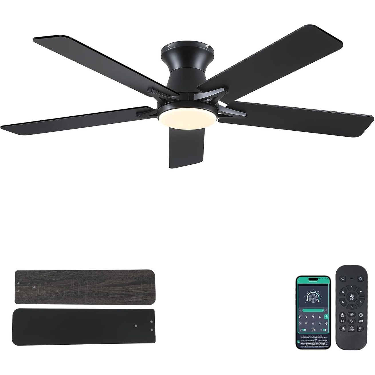 52 Inches Flush Mount Modern Quiet Ceiling Fan with Light and Remote APP Control 5 Dual Side Blades for Living Room Bedroom