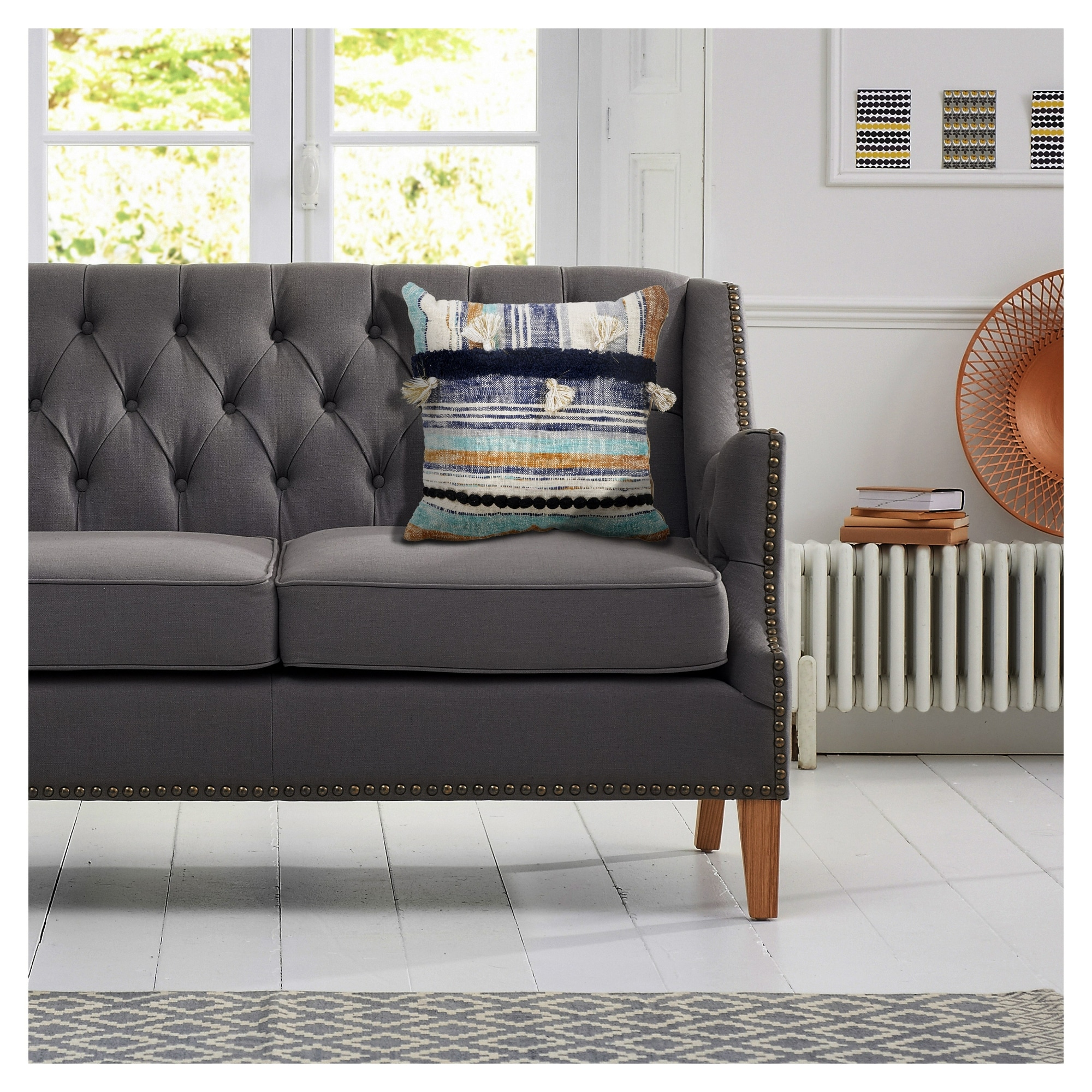 Handmade Striped Square Throw Pillow Cover with Tassels - 18" - Blue and Cream