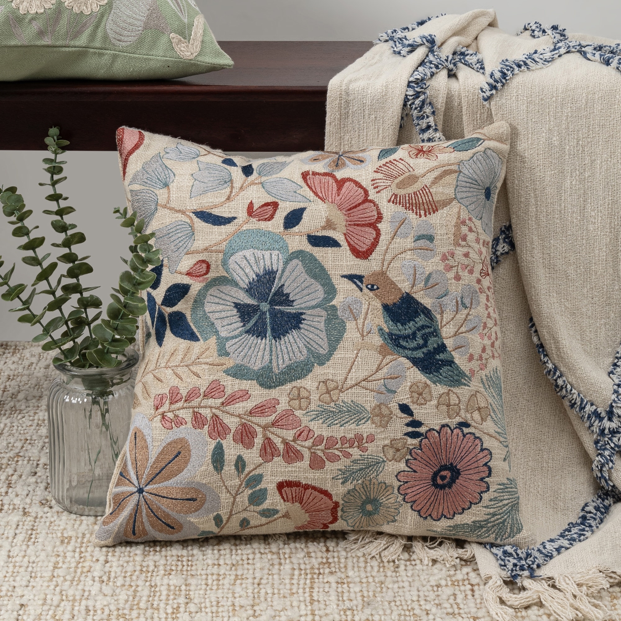 Handwoven Embroidered Bird and Floral Square Throw Pillow - 24" - Multicolor