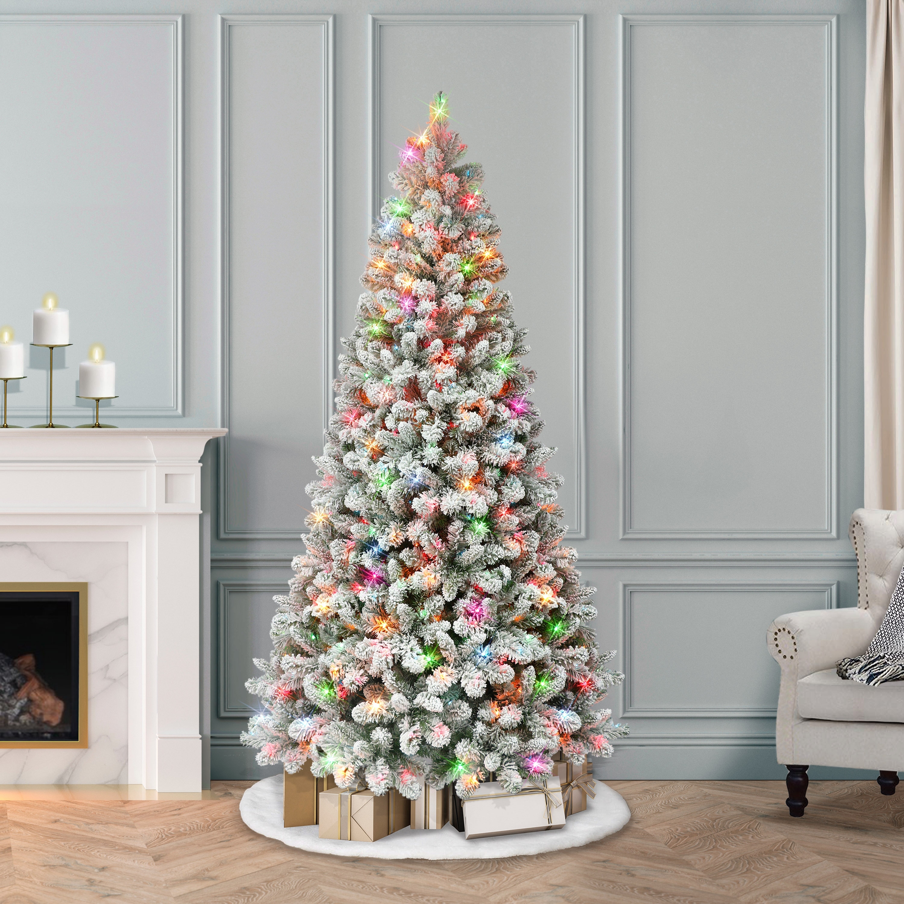 Realistic 9ft Pencil Snow Flocked Christmas Tree with Auto Open and Pine Branches, Xmas Decor for Home Office Holiday Party