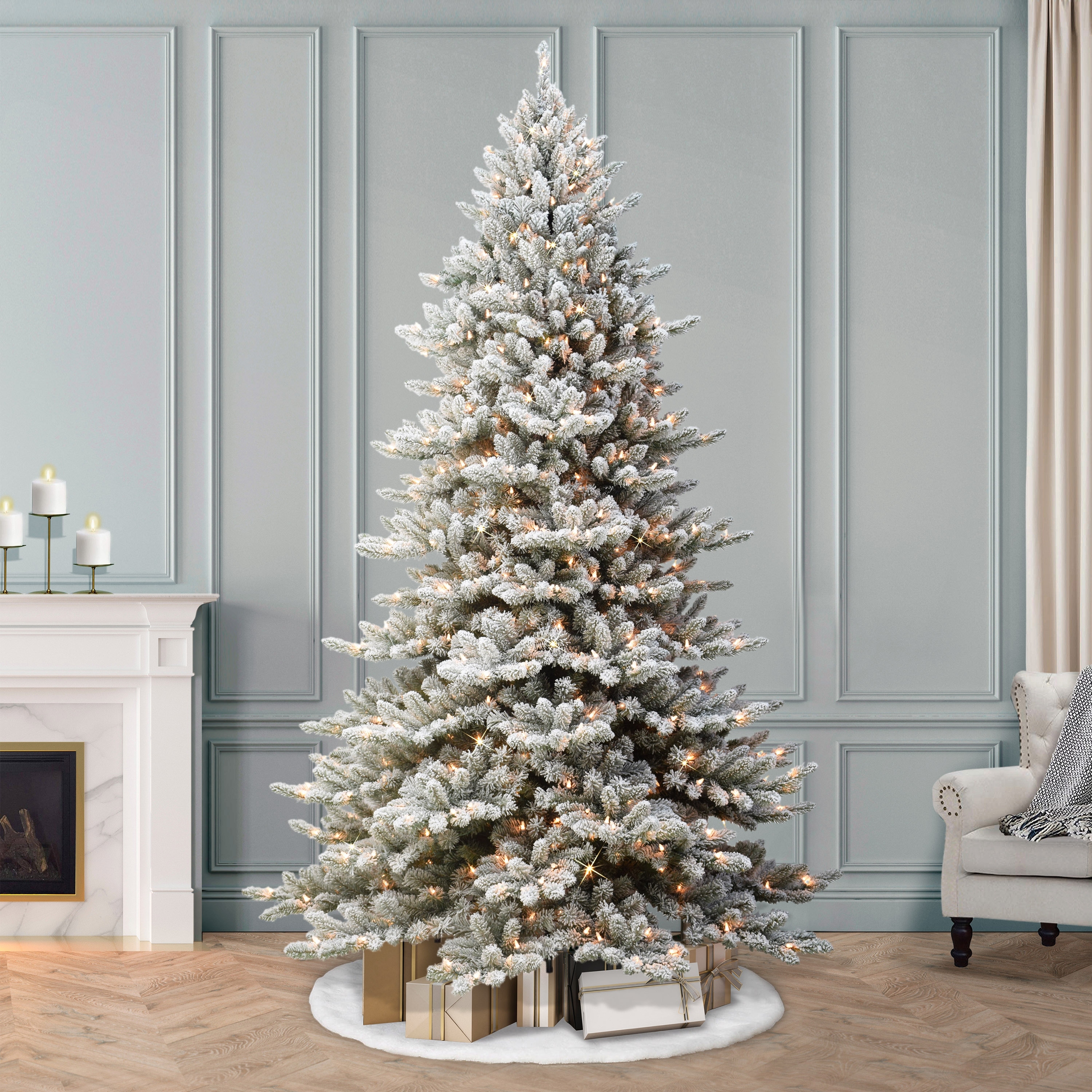 Puleo International 9 ft Pre-lit Flocked Royal Majestic Fraser Fir Artificial Christmas Tree with 800 Warm White LED Lights