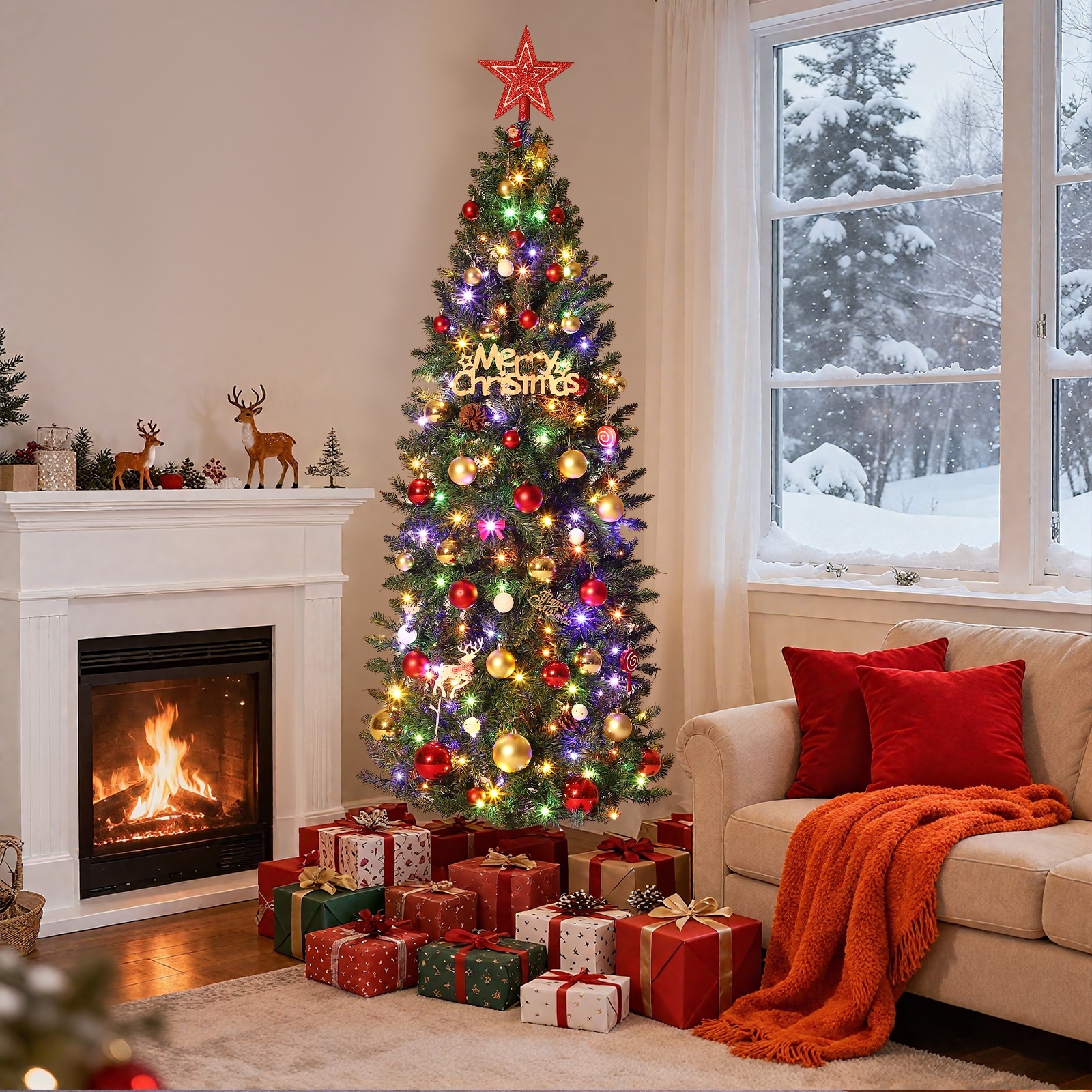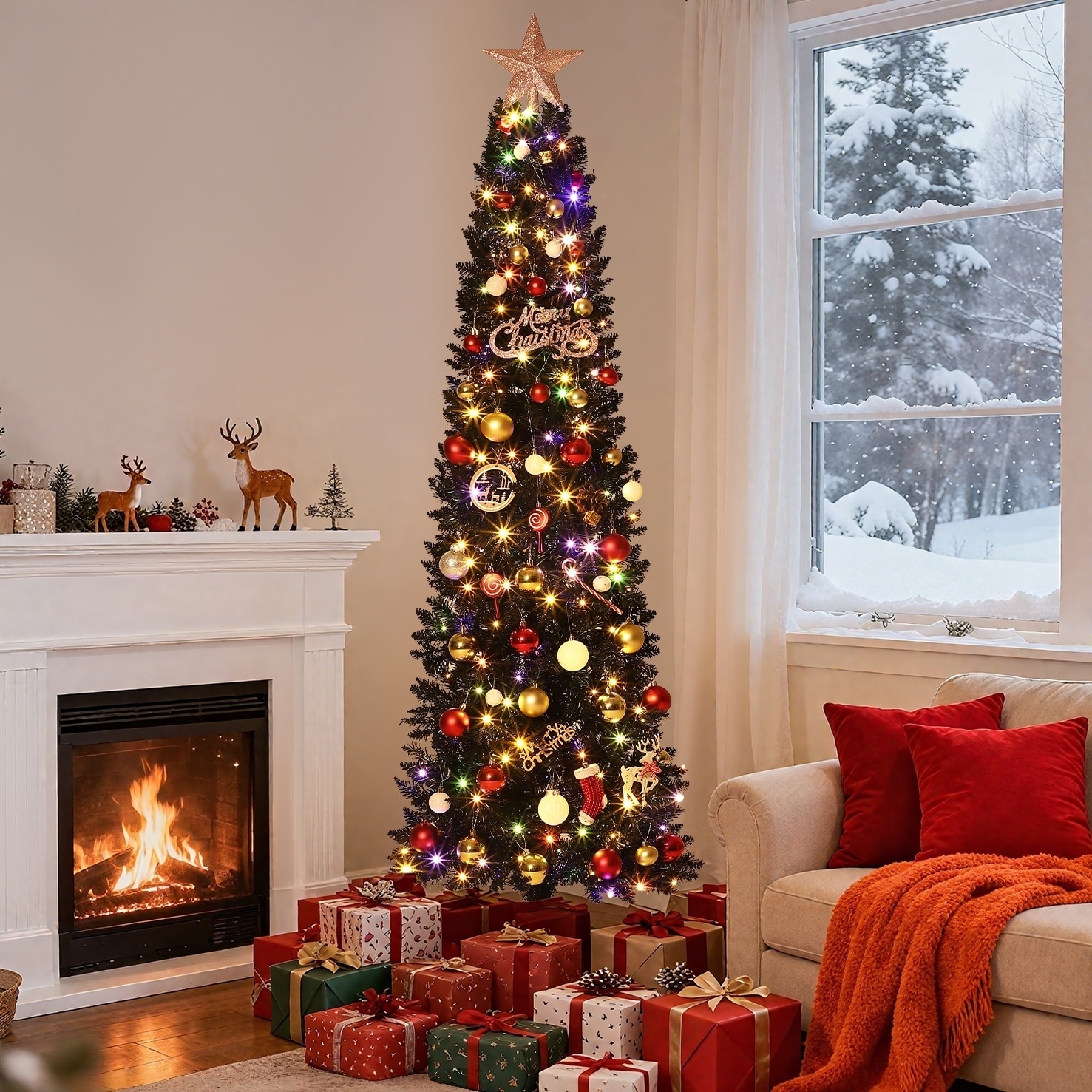 6 Ft Pre-Lit Pencil Christmas Tree, Slim Artificial Christmas Tree with 250 Colorful Led Lights