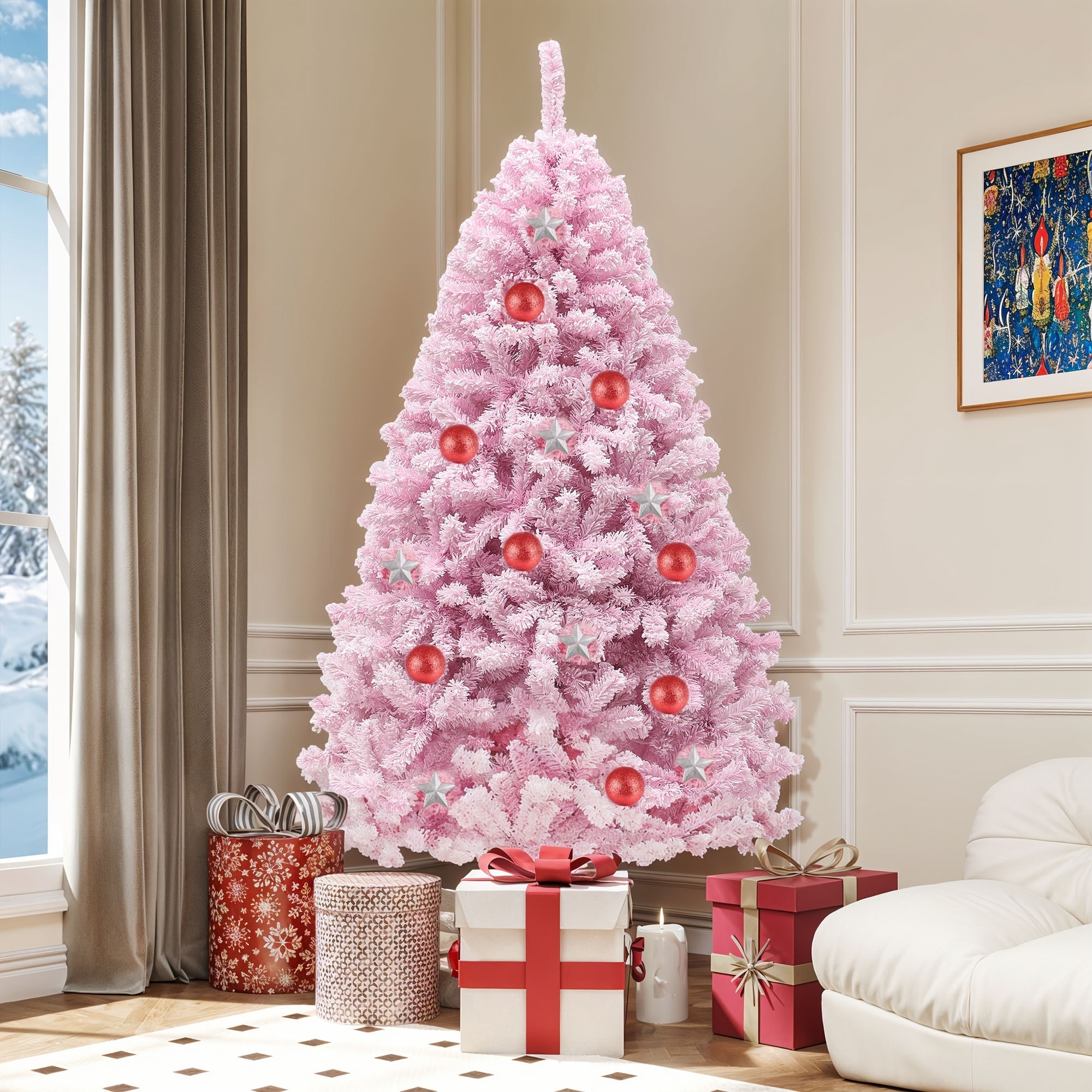 6/7.5 Ft Prelit Pink Flocked Spruce Christmas Tree