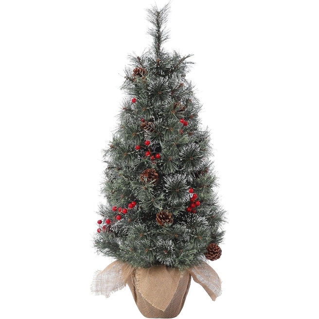 3ft Snow Flocked Christmas Tree with Pine Cones & Red Berries, Cloth Bag Base, Ideal for Fireplace or Tabletop