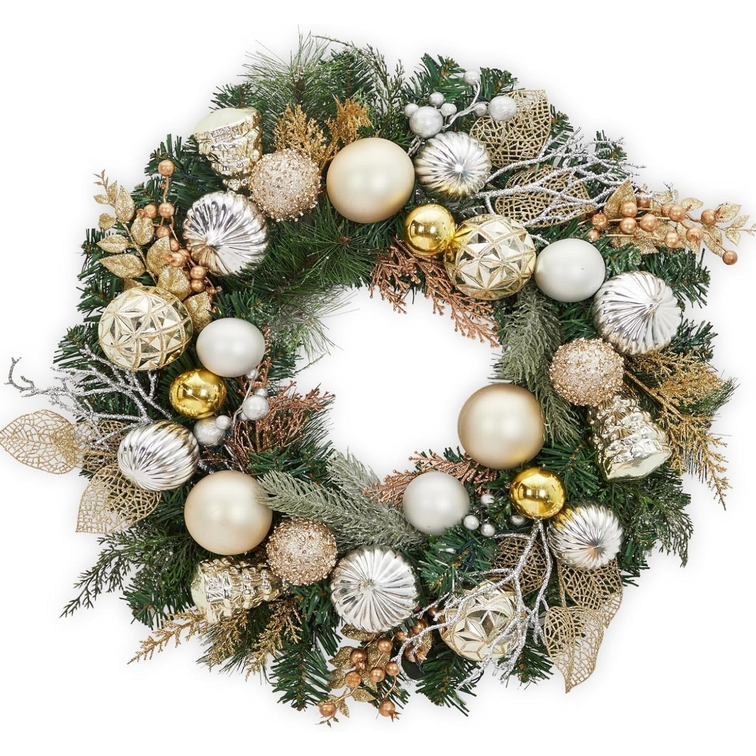 Glitzhome 24"D Ornament Berry Holly Pine Wreath With Lights and Timer Christmas Wall Decor