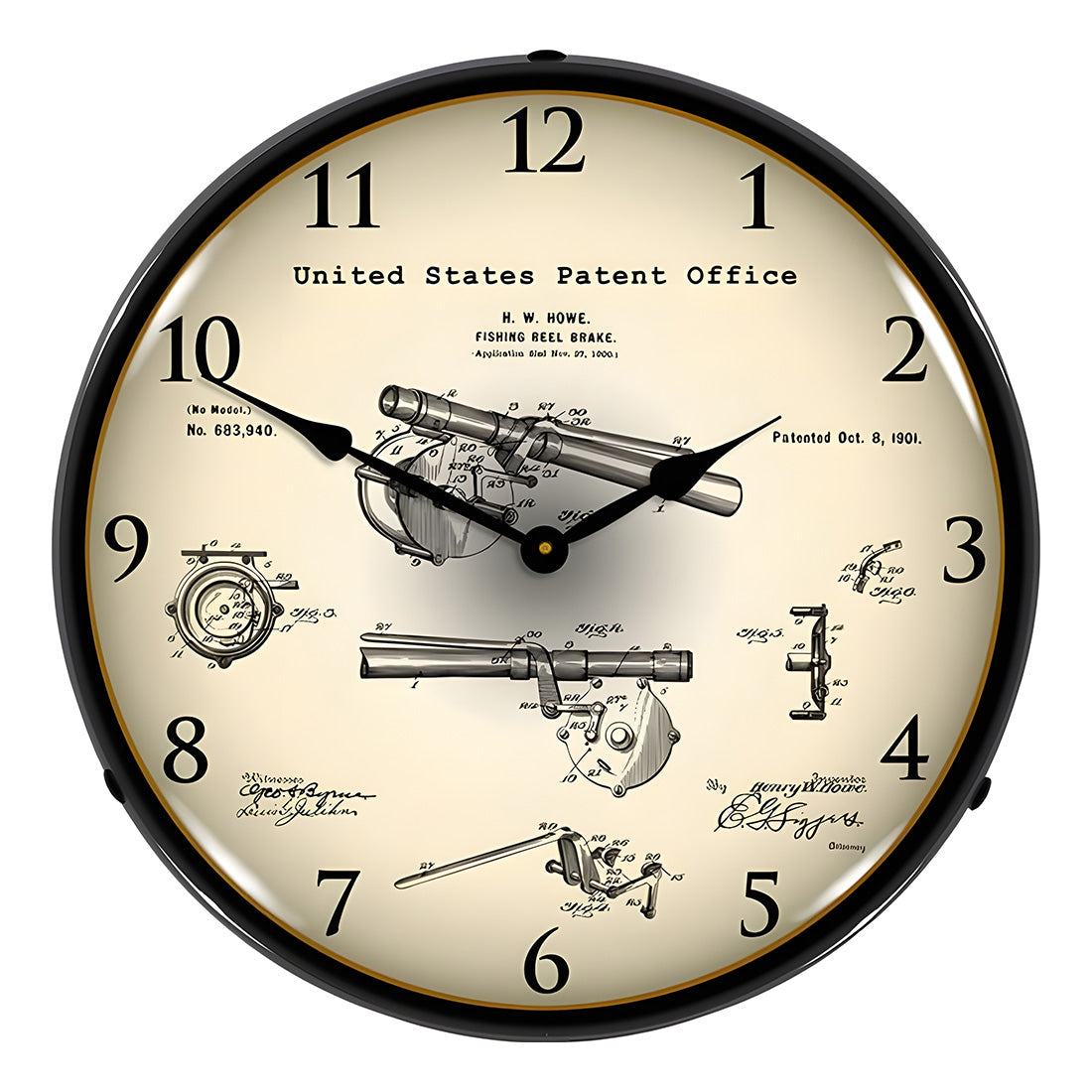 Collectable Sign and Clock 1901 Antique Fishing Reel Brake Patent Blueprint Backlit Wall Clock