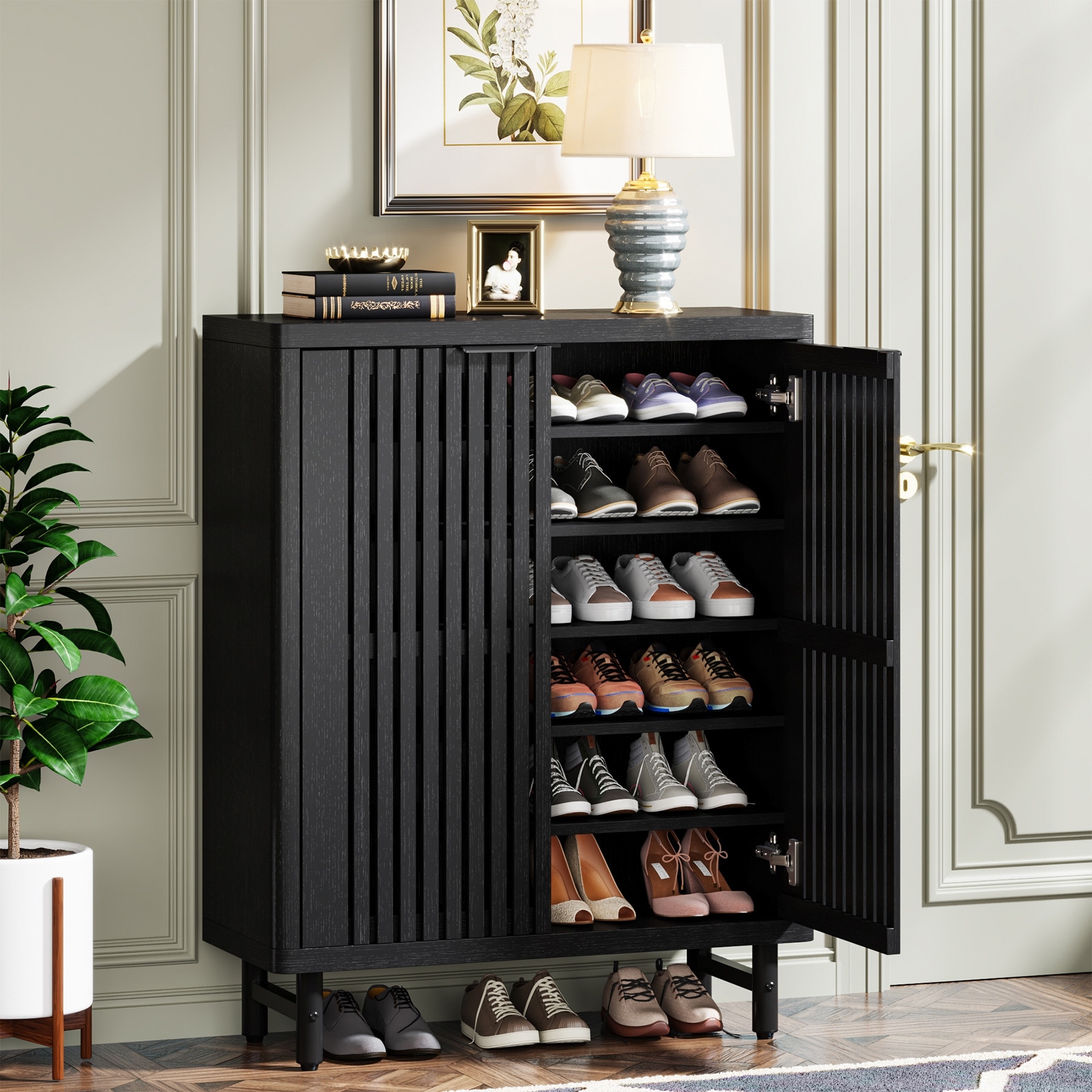 Wooden Shoe Cabinet with Shutter Doors, Adjustable Shelves Large Hidden Storage Organizer Rack for Entryway Hallway