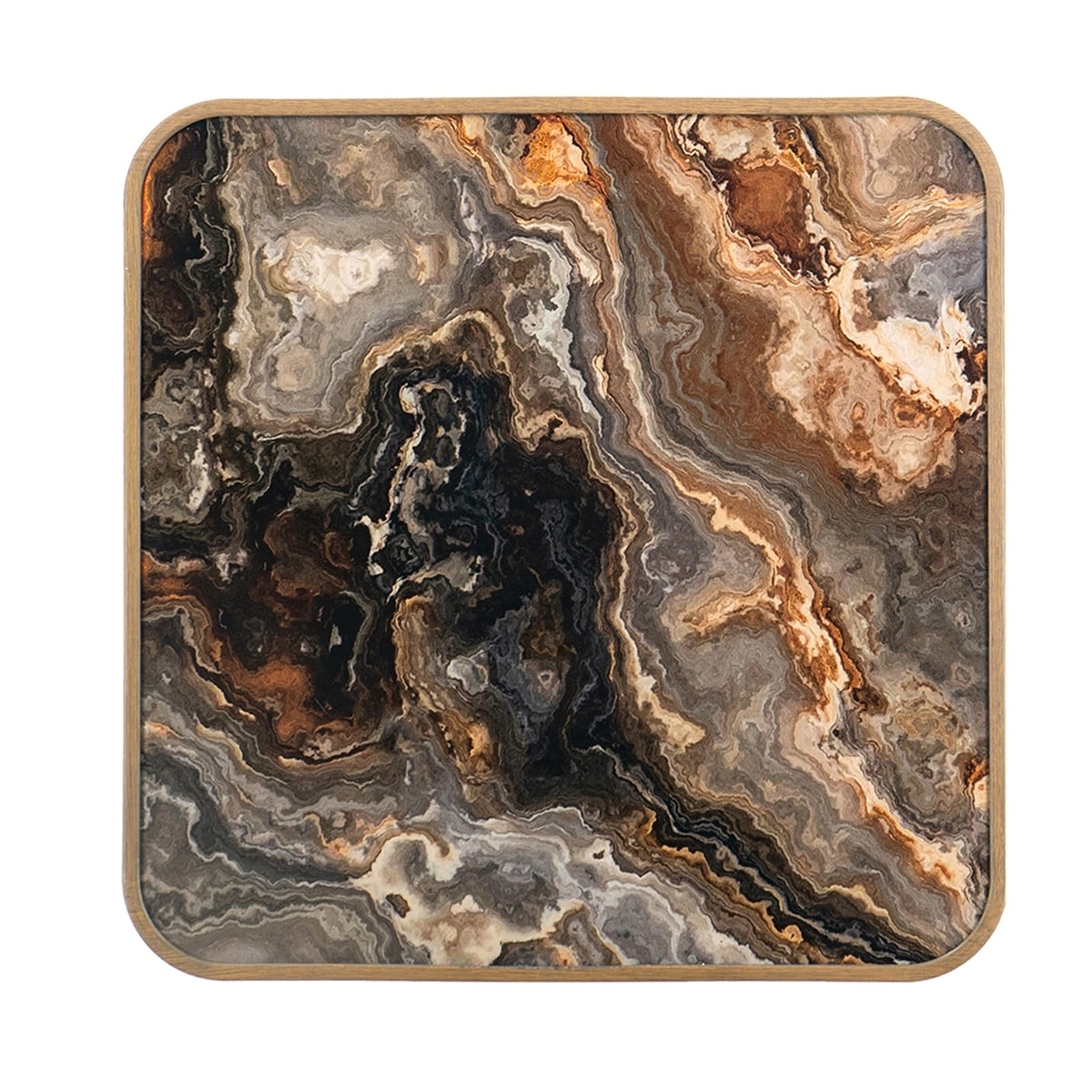 Square Side Table with Glass Top, Marbled Design, and Iron Legs