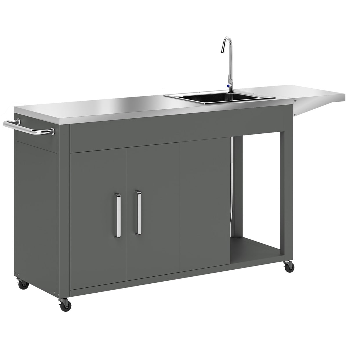 Dark Grey Outdoor Grill Cart with Stainless Steel Sink Foldable Side Leaf and Storage Cabinet - 64" W x 18.5" D x 34.3" H