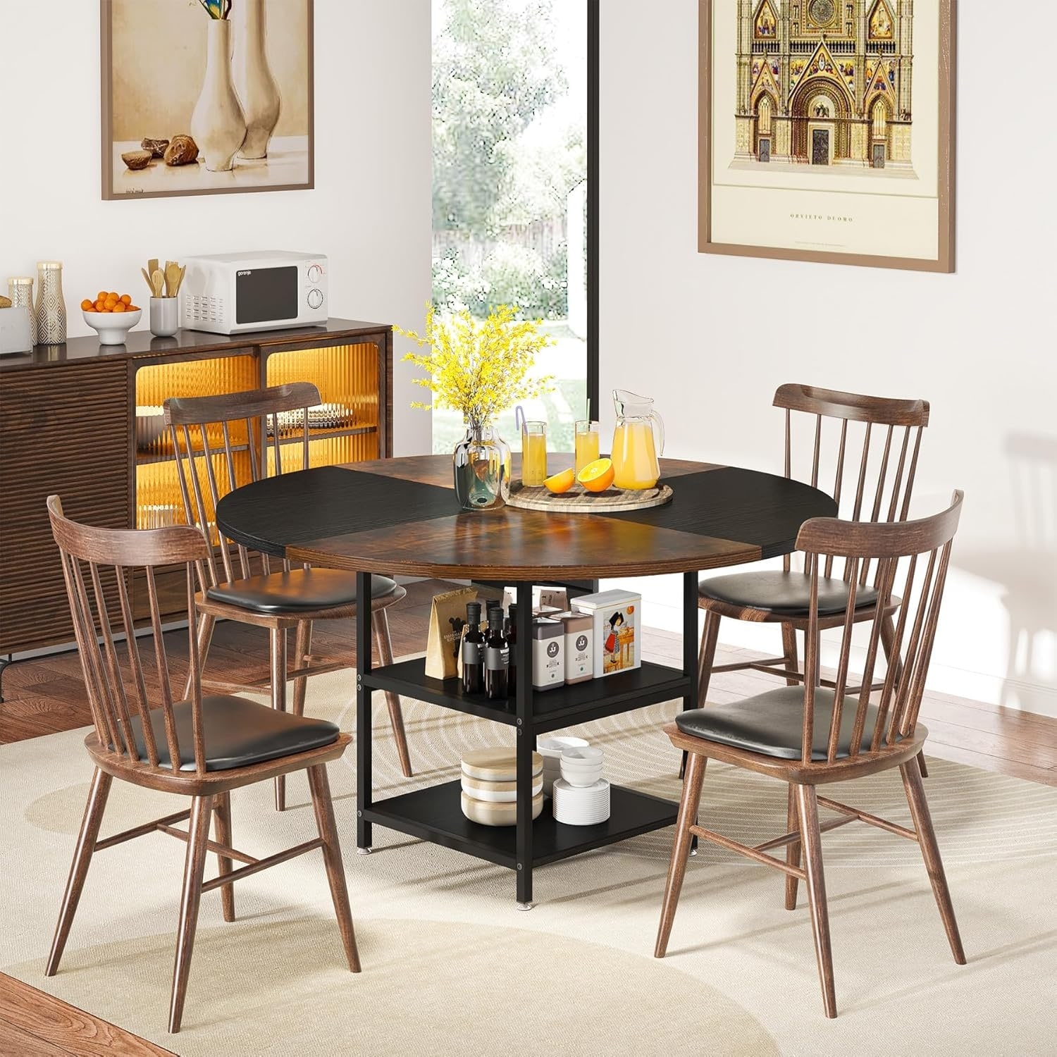 47-Inch Round Wood Dining Table for 4 With Storage Shelf Large Kitchen Table for Home Dining/Living Room