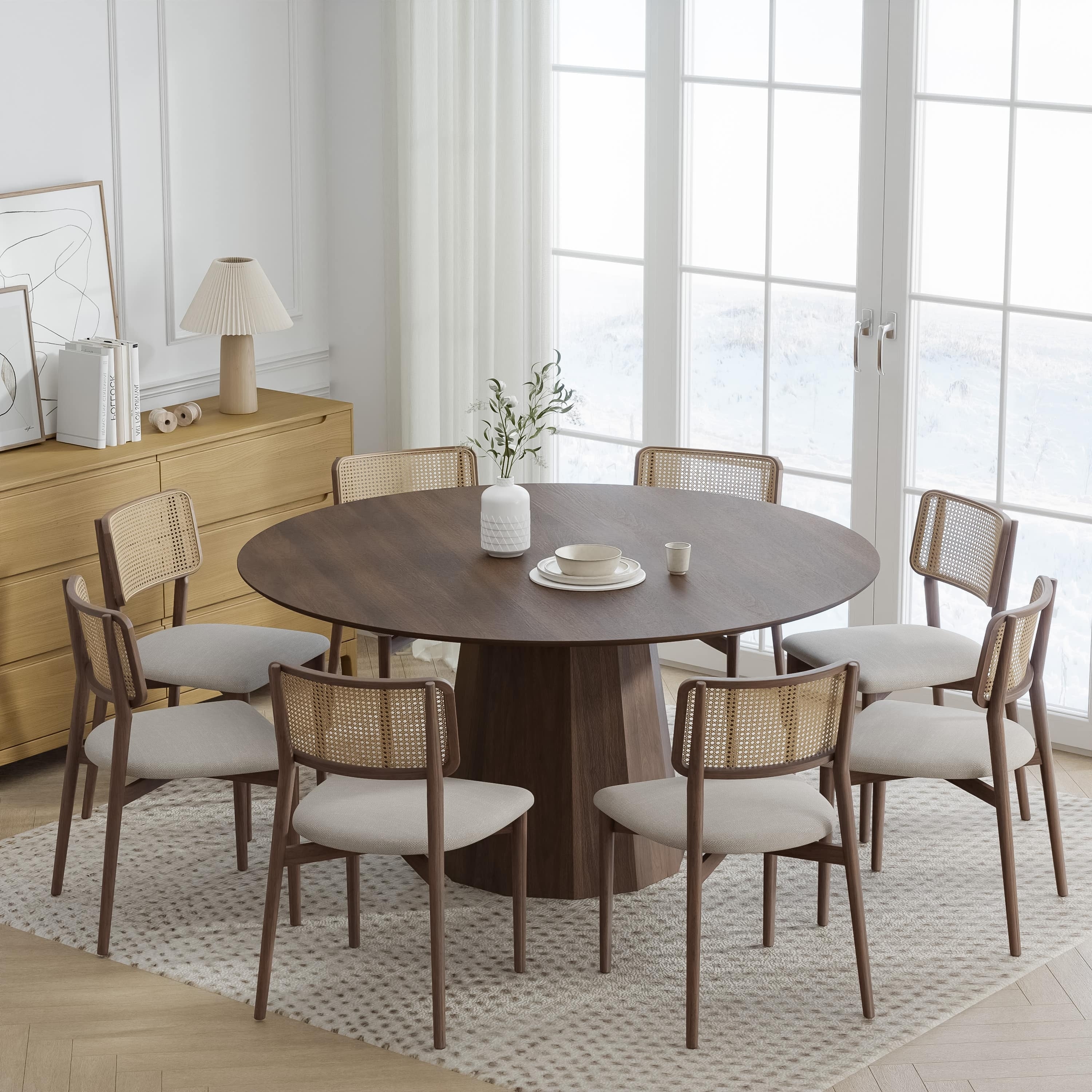 7-Piece Dining Set - Linen Fabric Chairs & Pedestal Table - Antique Walnut Finish - Kitchen Dining Room Set - 92