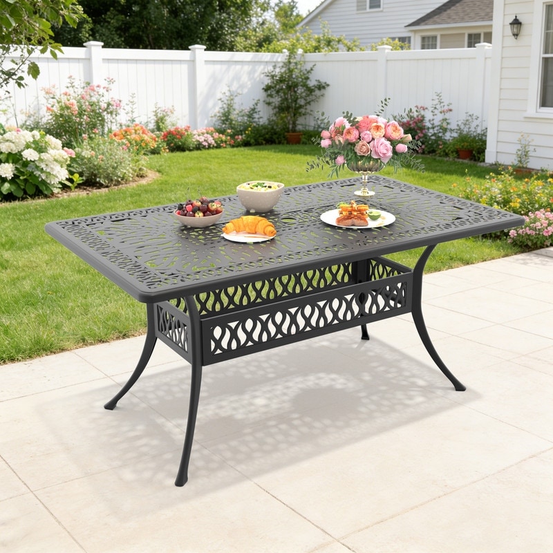 58.27 inch Black Rectangle Cast Aluminum Patio Table with Umbrella Hole
