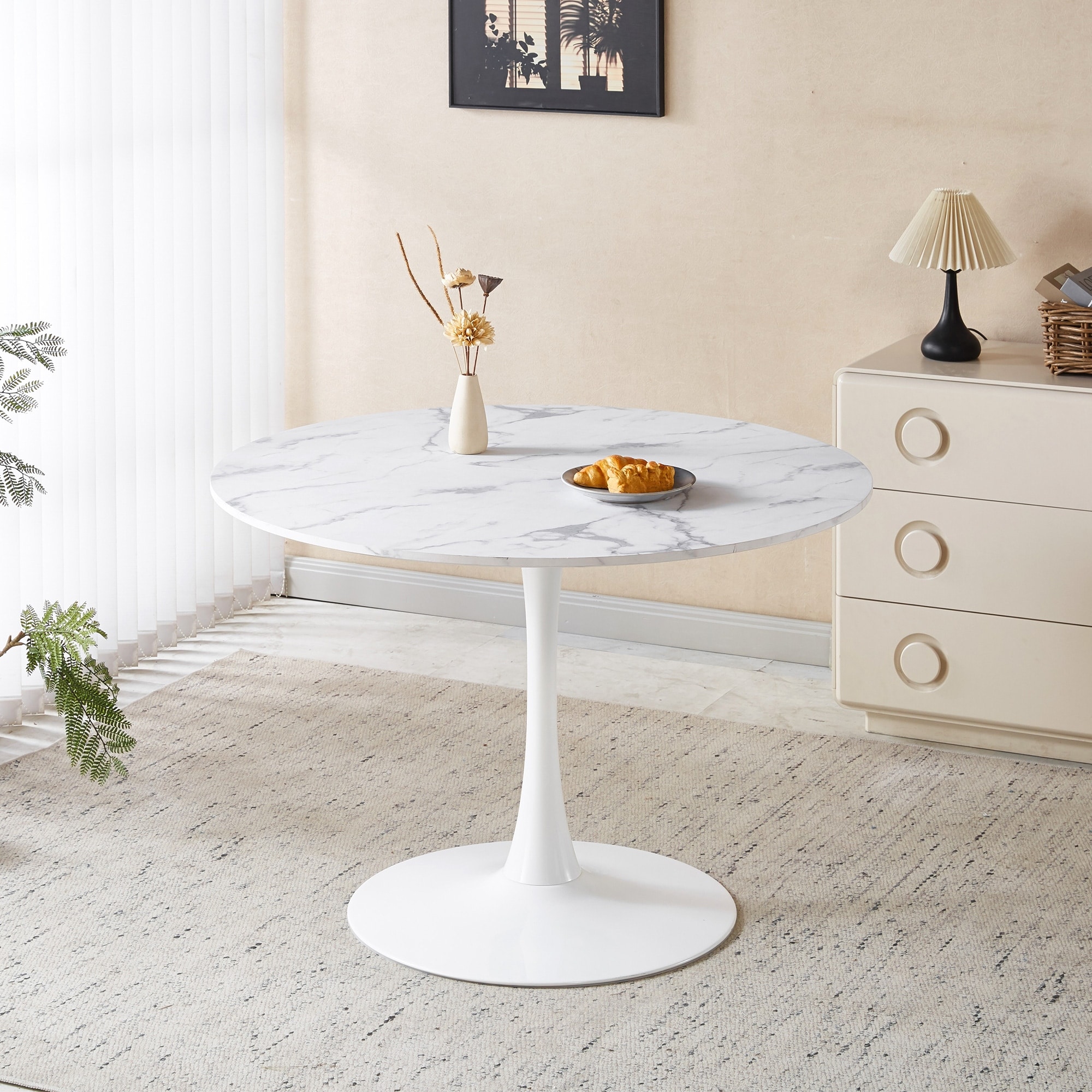 Modern 35.43 Inch Round Dining Table, Glossy Sintered Stone Top with Pleated PU Leather Iron Pedestal, Adjustable Feet - White