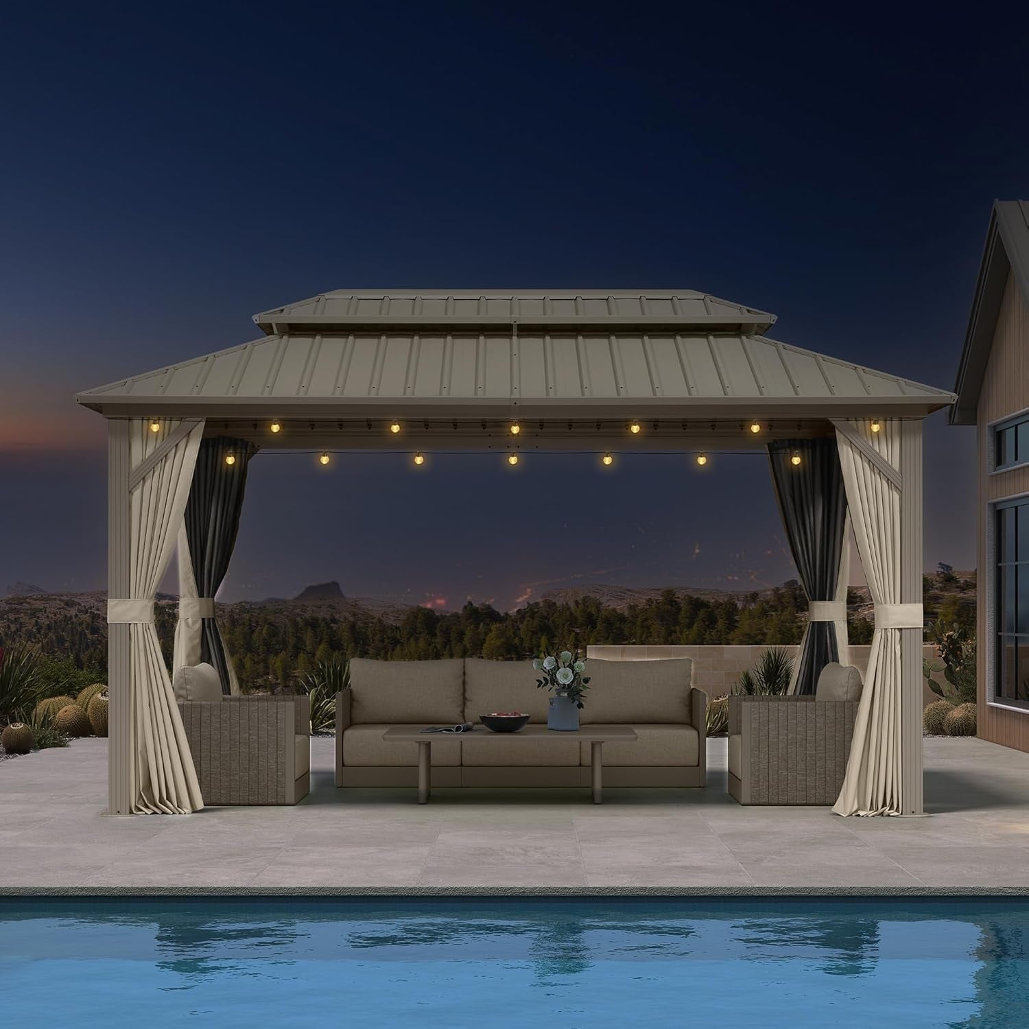 PURPLE LEAF Outdoor Hardtop Gazebo Champagne Metal Frame Galvanized Steel Double Roof with Curtains and Netting for Poolside