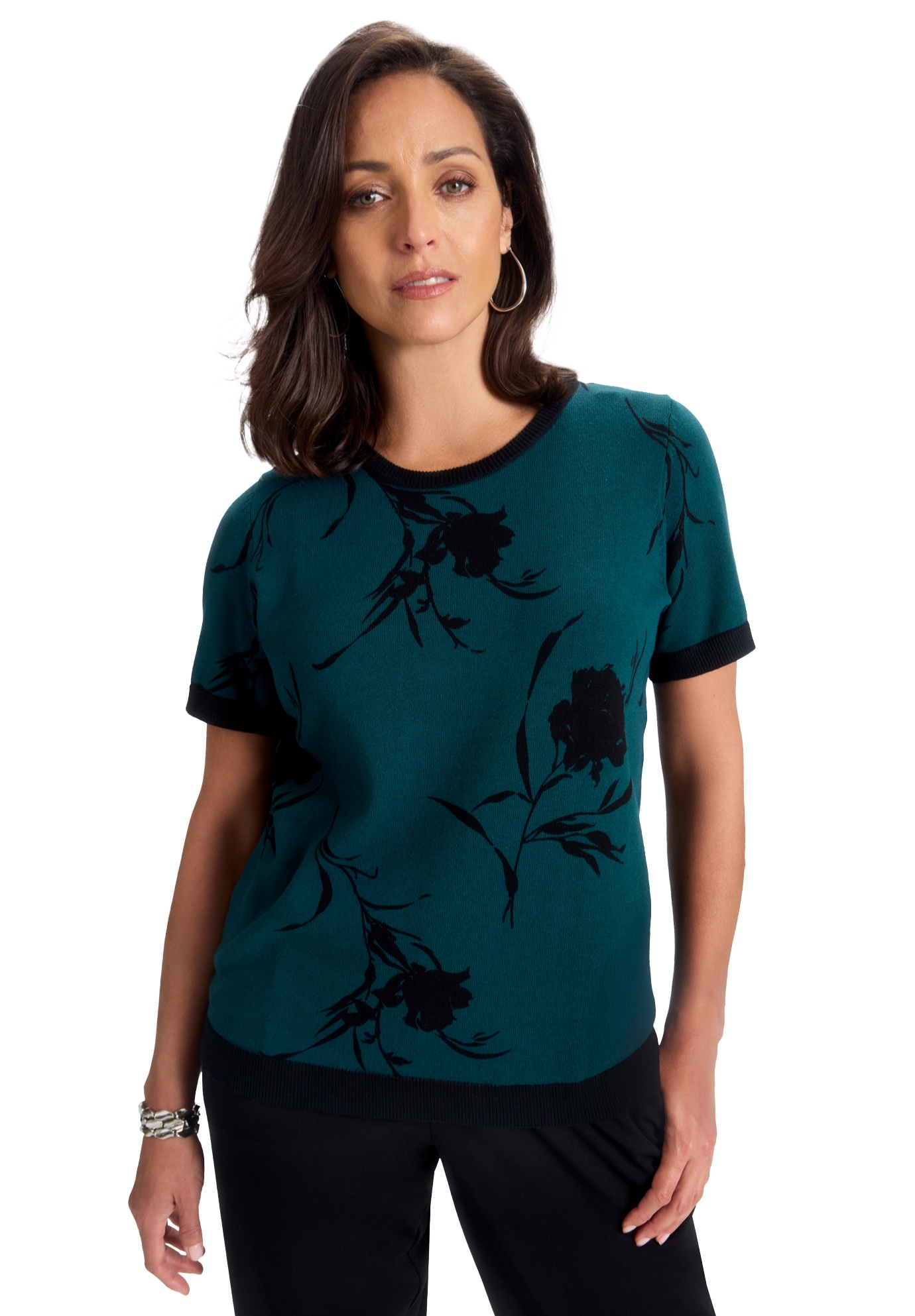 Plus Size Women's Fine Gauge Crewneck Shell by Jessica London in Emerald Bold Rose (Size 12) Short Sleeve Sweater